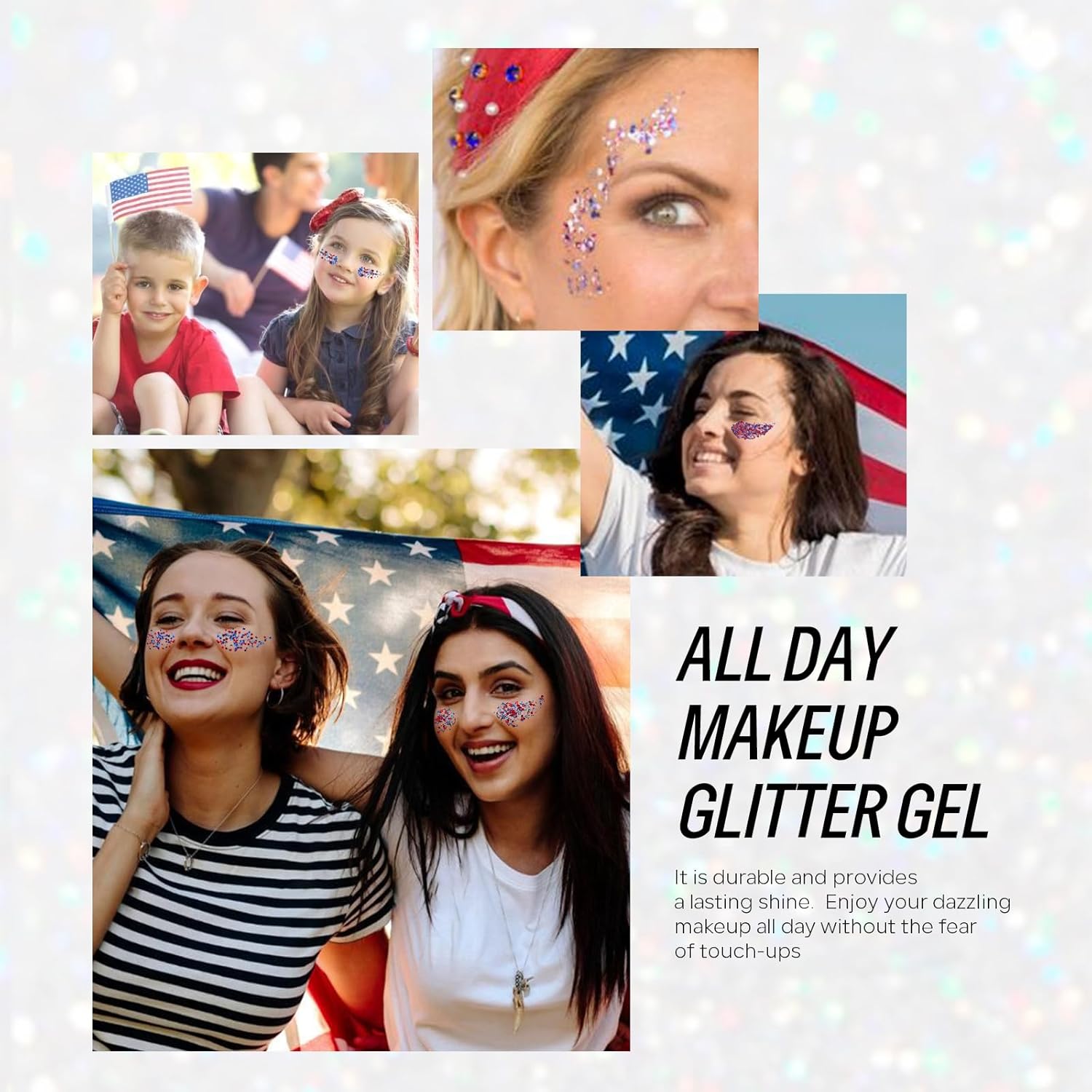 - 【Festival Rave Accessories】Red, white and blue sequin gel can be used on the body, face, hair, lips and more to add a festive touch to your 4th of July accessories. Perfect for Independence Day, 4th of July, National Day, America's Patriotic Events, Presidents' Day,School Patriotic Activities, Parade,Veterans Day, Memorial Day.
