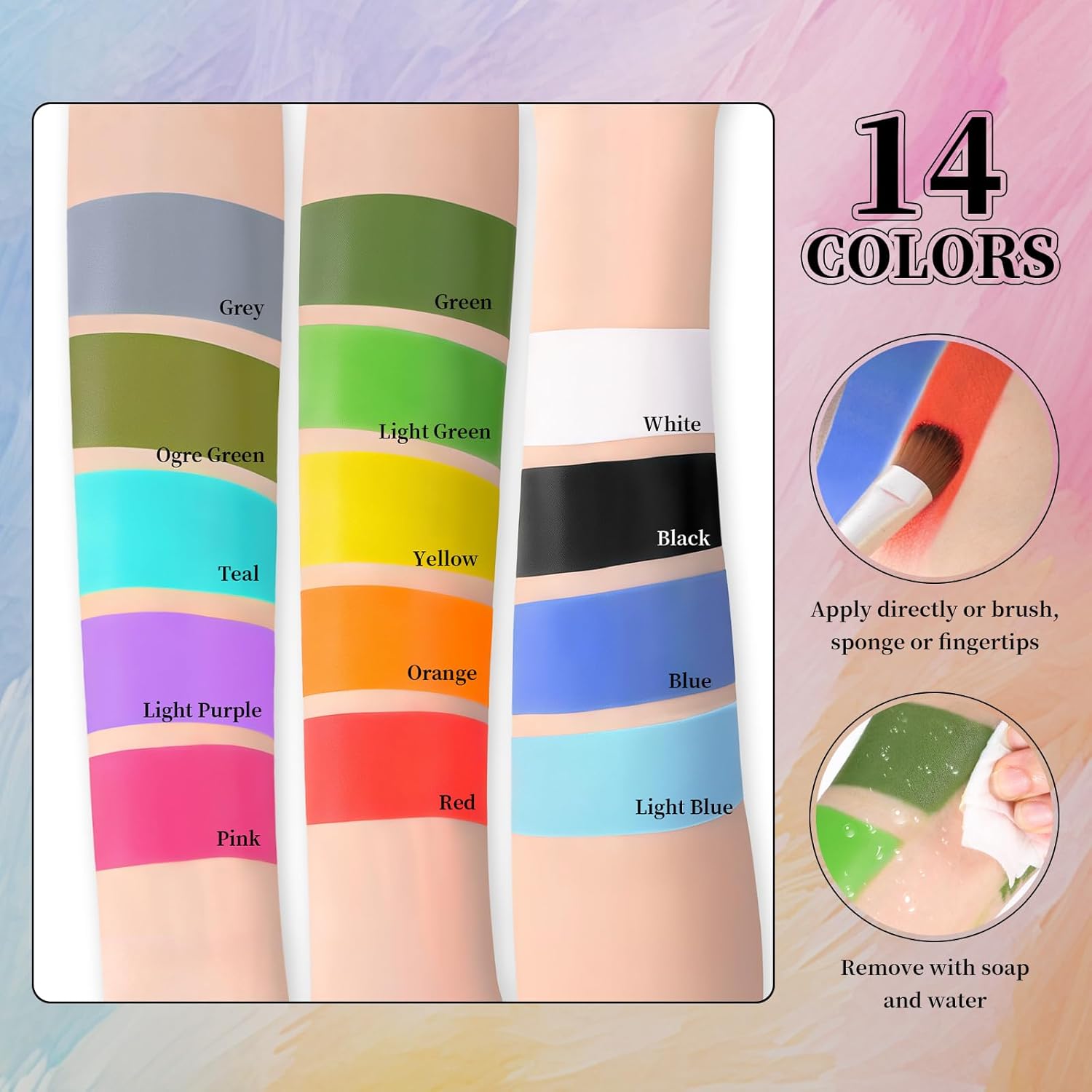 - [Safe & Non-toxic] Made from non-toxic and safe water-based ingredients, it is safe and suitable for all skin types. Note: Our face paint is not waterproof. (Do not apply body paint when it's raining.) These colors are also very easy to remove. You can first wipe off most of the cosmetics with a wet tissue, and then use makeup remover water to remove the remaining colors. Due to individual differences in skin sensitivity, we strongly recommend conducting a small skin patch test before use