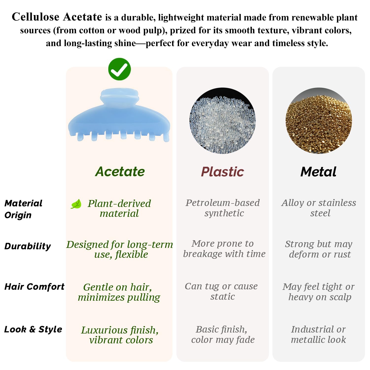 - PREMIUM ACETATE MATERIAL: Made from high-quality plant-derived Cellulose Acetate, this claw clip is more flexible and longer-lasting than regular plastic clips. Known for its smooth texture and gentle feel on hair, it offers a refined, everyday alternative to petroleum-based plastics