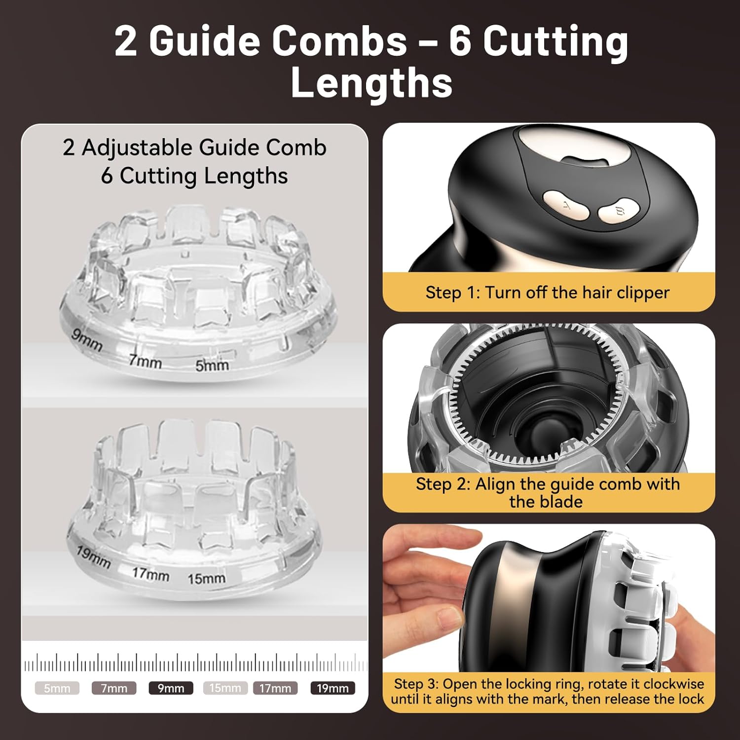 - 2 GUIDE COMBS FOR PERFECT SHORT HAIRCUTS: Includes 2 durable guide combs with 6 cutting lengths: 5mm, 7mm, 9mm, 15mm, 17mm, and 19mm. Use the clipper without a guard for an ultra-close 1mm trim. Ideal for buzz cuts, crew cuts, and flat tops — all easy to achieve with even, sharp cuts