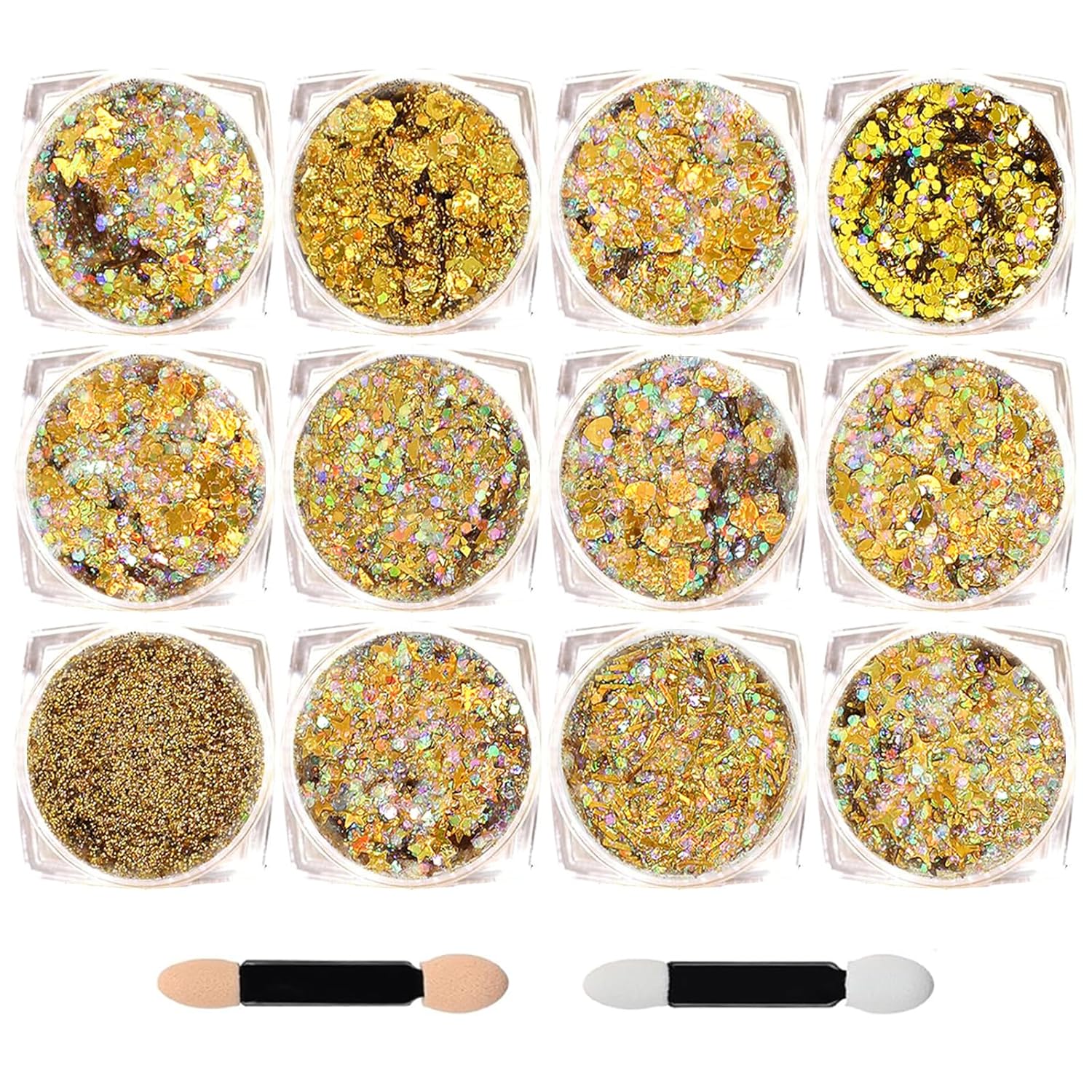 Body Glitter Face Glitter, Hair Glitter for Kids, 12 Shapes Fine Chunky Glitter Gel for Women Girls Makeup Sparkles Party Mermaid Sequins Rave Accessories Singer Concerts Festival (Gold Scheme)