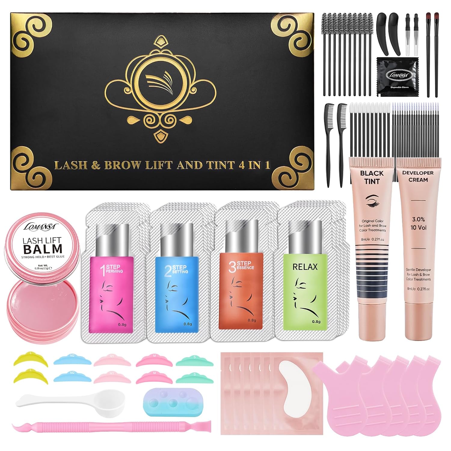 - 4 in 1 Lash & Brow Lift: This is a 4-function kit that includes lash lift, brow lamination, lash black and brow color. Lomansa kit contains all the tools you need to lift your lashes and brows
