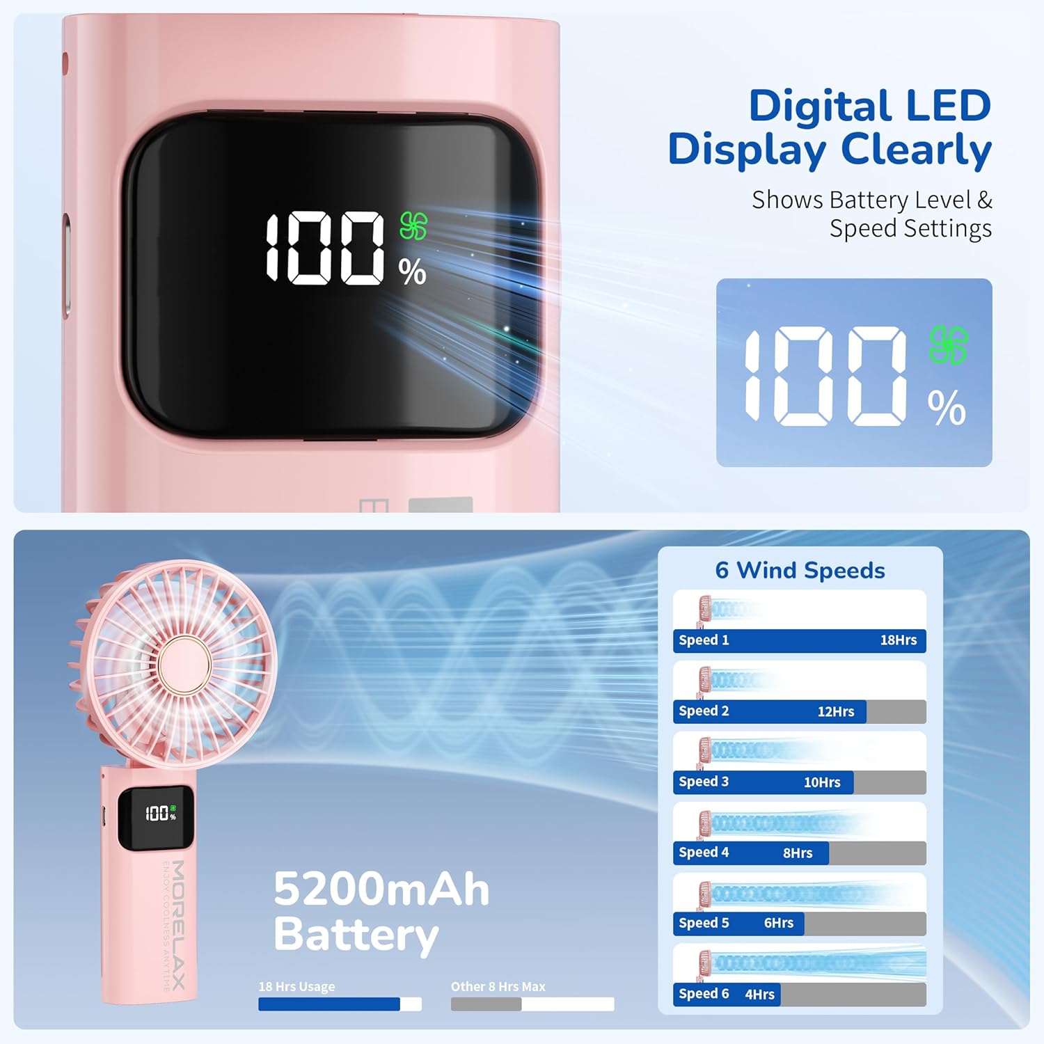 - [Silent & 6-Speed Adjustable] The Morelax portable fan operates at a noise level of <25db, ensuring ultra-silence. It offers 6 adjustable wind speeds, increasing from 1 to 6, with the strongest setting being the 6th speed. Equipped with an intelligent digital screen that displays the wind speed level and remaining battery power, it allows for timely charging to meet your personal cooling needs.