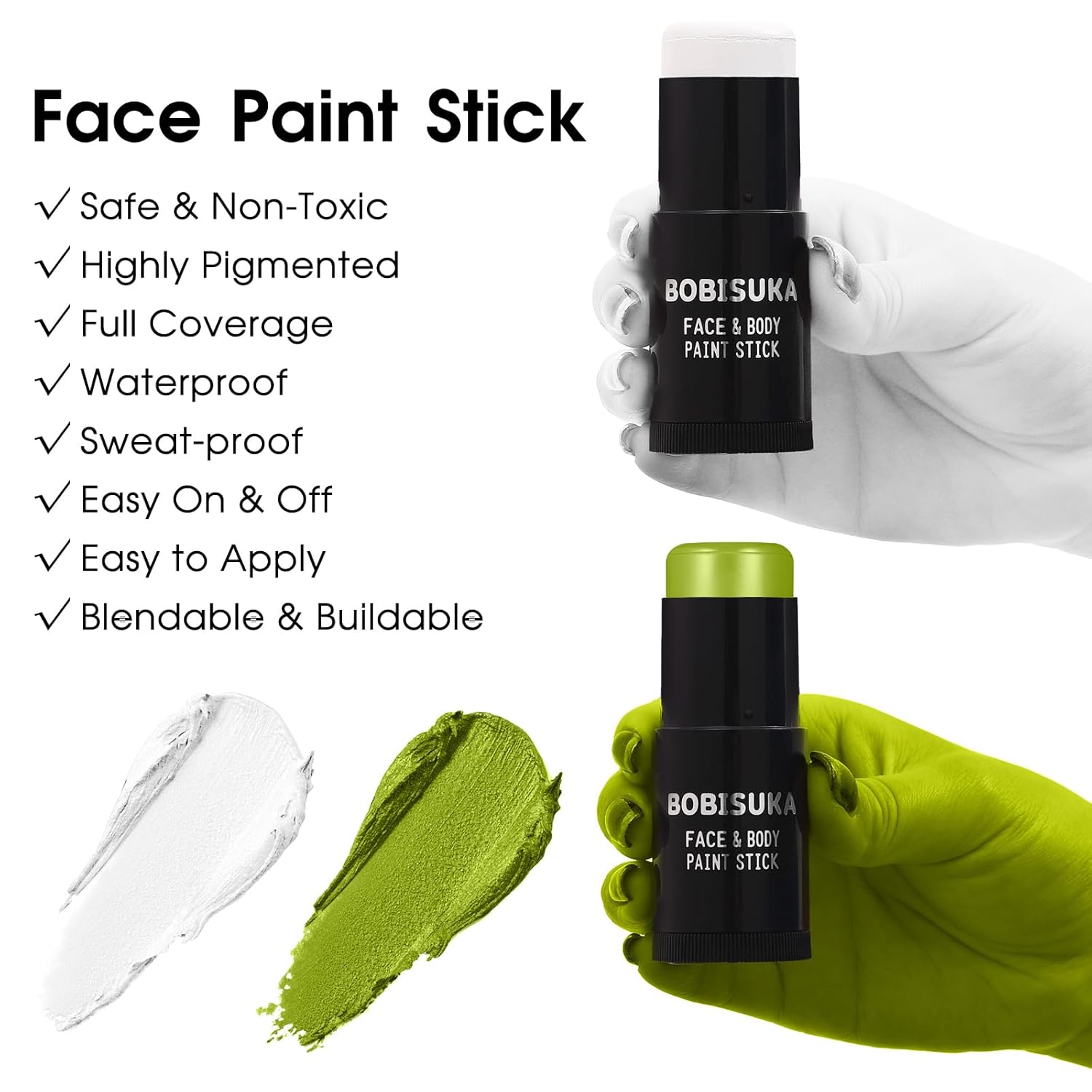 - COMPLETE SFX MAKEUP KIT – This set includes two creamy face and body paint sticks in vivid light green and white, one matte black single eyeshadow, a black liquid eyeliner pen, setting powder, and two soft sponges. Perfect for creating a variety of Halloween, cosplay, or theatrical looks.