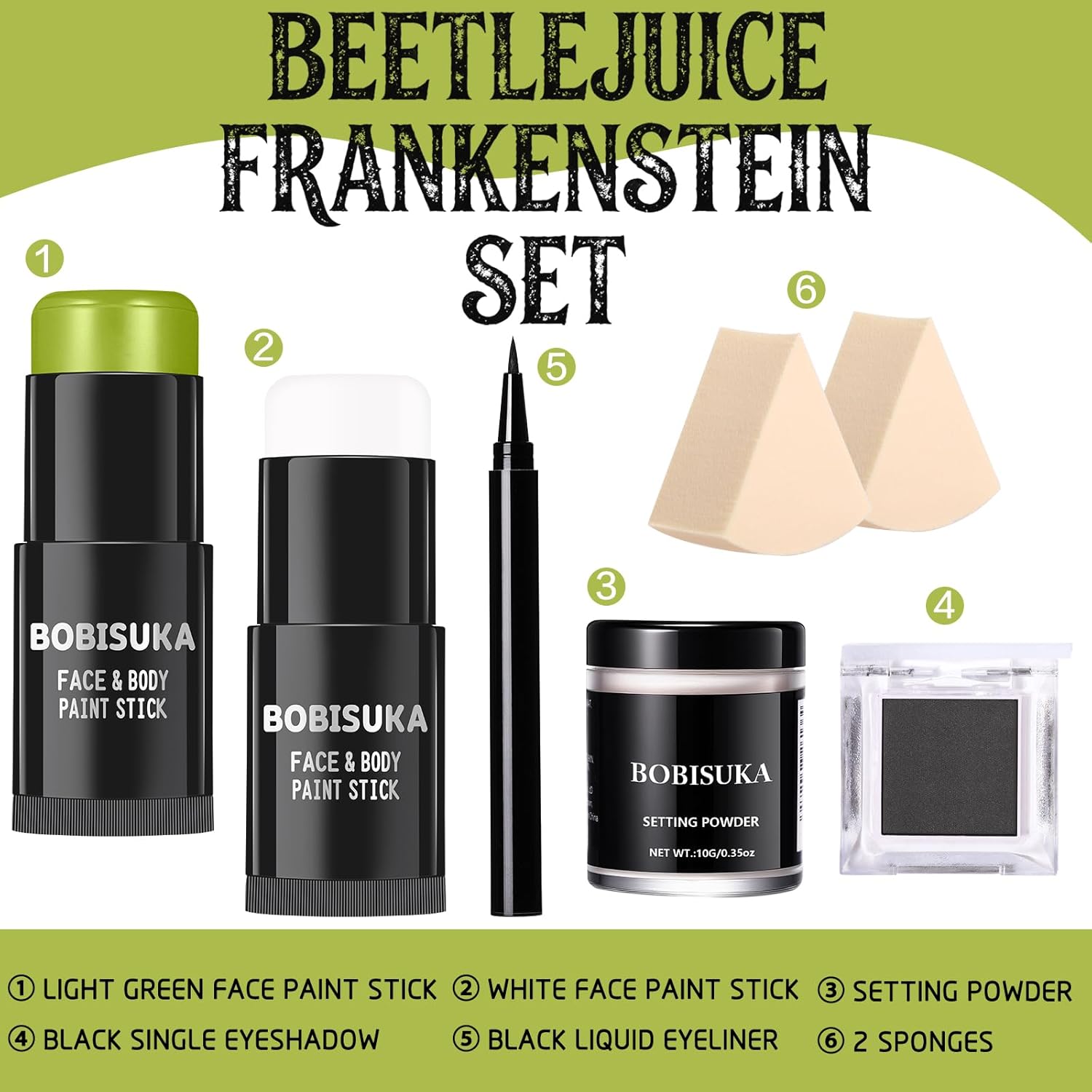 BOBISUKA Light Green & White Face Body Paint Stick Kit with Black Eyeshadow, Black Liquid Eyeliner, Setting Powder & 2 Sponges – Halloween Cosplay Makeup Set for Witch, Beetle Juice, Monster, Goblin