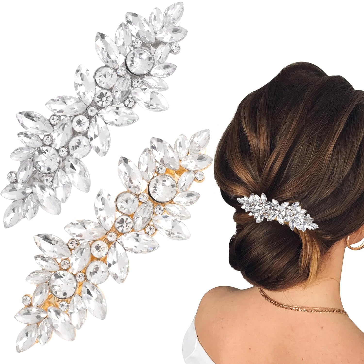 ANCIRS 2 Pcs Rhinestone Hair Clips, Crystal Hair Clip for Wedding, Silver Wedding Hair Pins, Sparkly French Hair Barrettes for Bridal Brides Women Thick Long Hair (Gold+Silver)