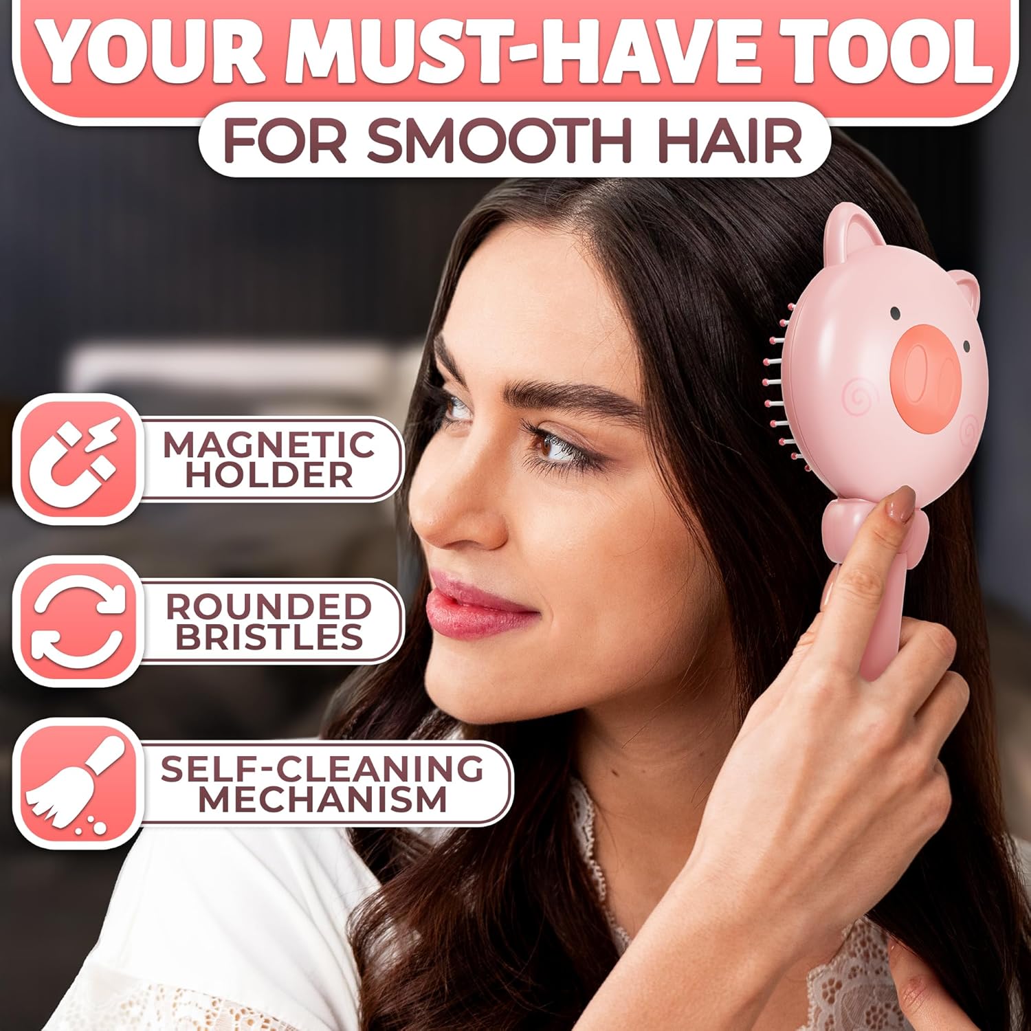 Retractable Hair Brush Pink Pig Designed - Compact 7.87 х 3.66 Inches Self Cleaning Hair Brush for Women with Magnetic Attach - Effective Detangling & Self Cleaning Hairbrushes with Soft Bristles