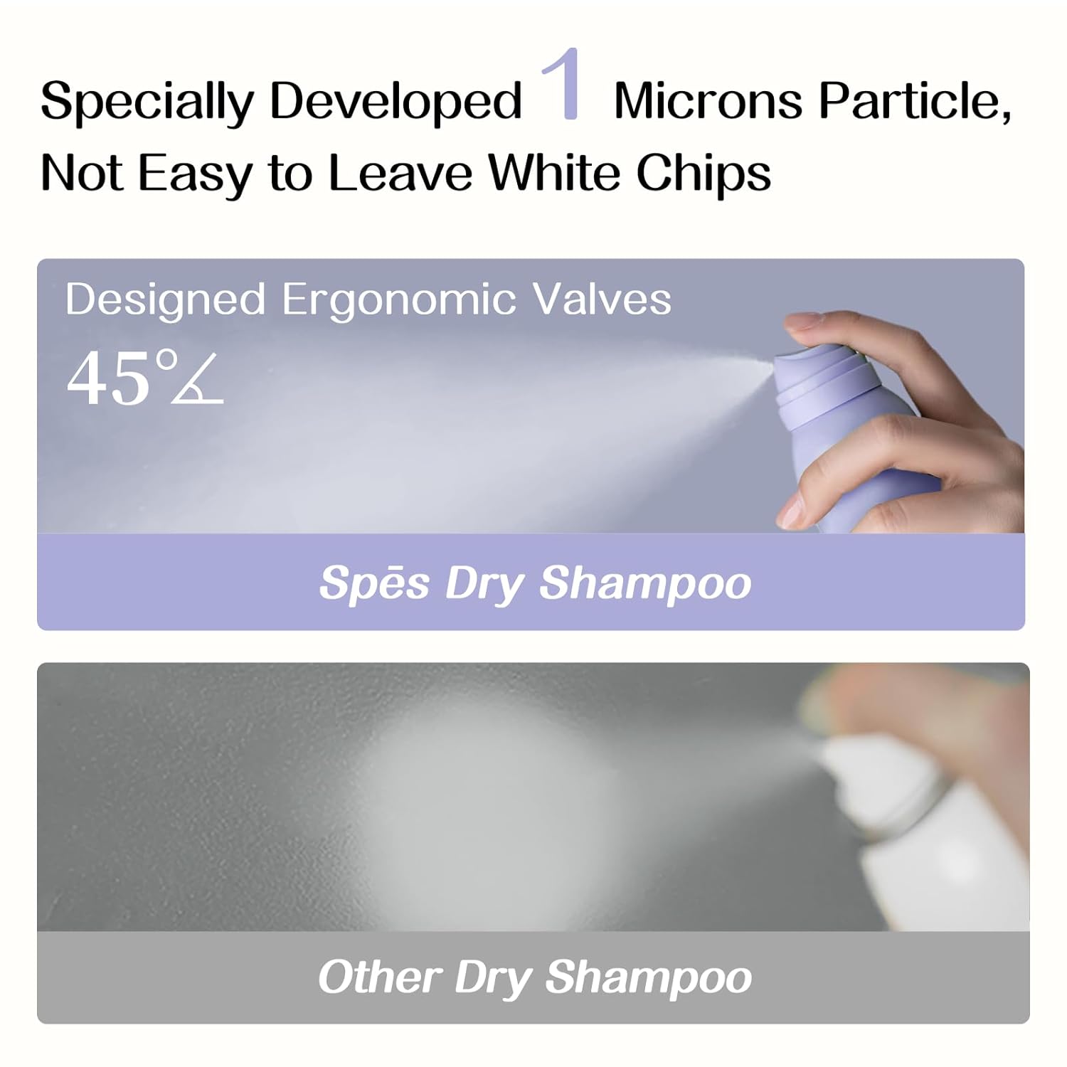 - NO WHITE RESIDUE AFTER USE: Spes Instant Fresh Volume Dry Shampoo uses a unique patent to make the diameter of the cleaning particles only 1 micron, which is 1/200 of the diameter of the hair. It instantly absorbs oil and restores fresh and volumized hair without leaving any white streaks or residue on your hair.