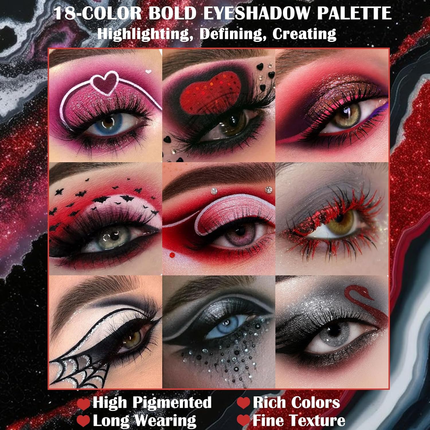 - 【Black & Red Gothic Eyeshadow Palette- Smokey Neutrals & Fiery Warm Tones】This versatile 18-color eye shadows palette for women featuring two distinct color themes: 9 cool-toned shades (black, white, silver, gray and charcoal) on the left and 9 warm-toned shades (red, burgundy, pink, and orange) on the right. Designed for bold artistic creations and everyday wear, ideal for Halloween themed makeup, smoky goth makeup, edgy grunge looks, soft sunset glam, emo makeup, stage makeup, costume cosplay, rave parties and more.