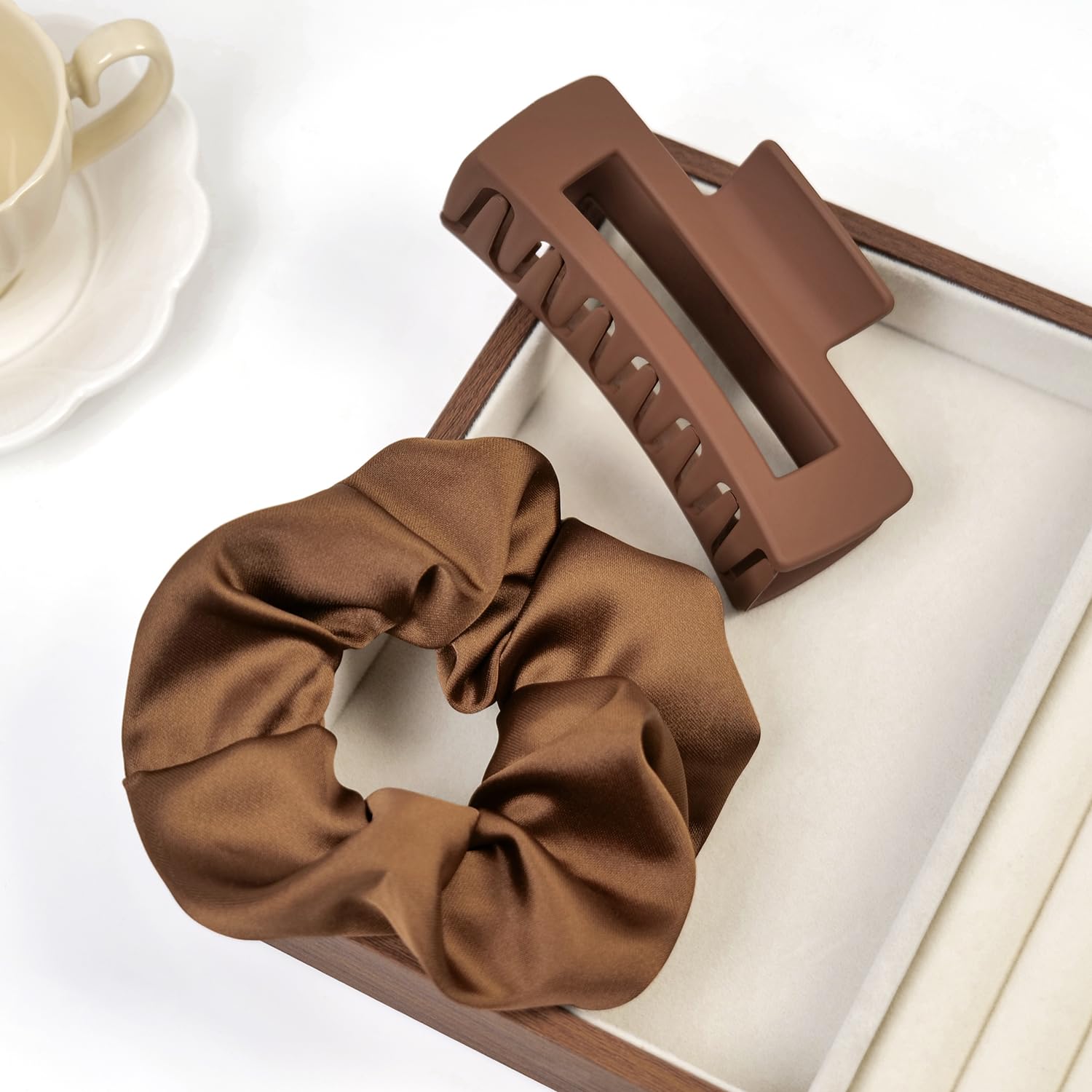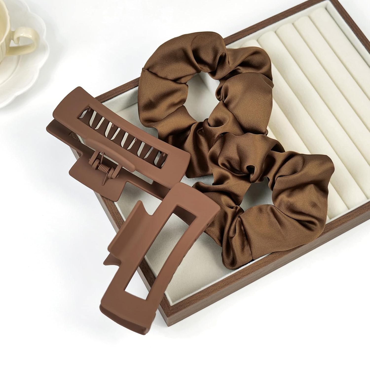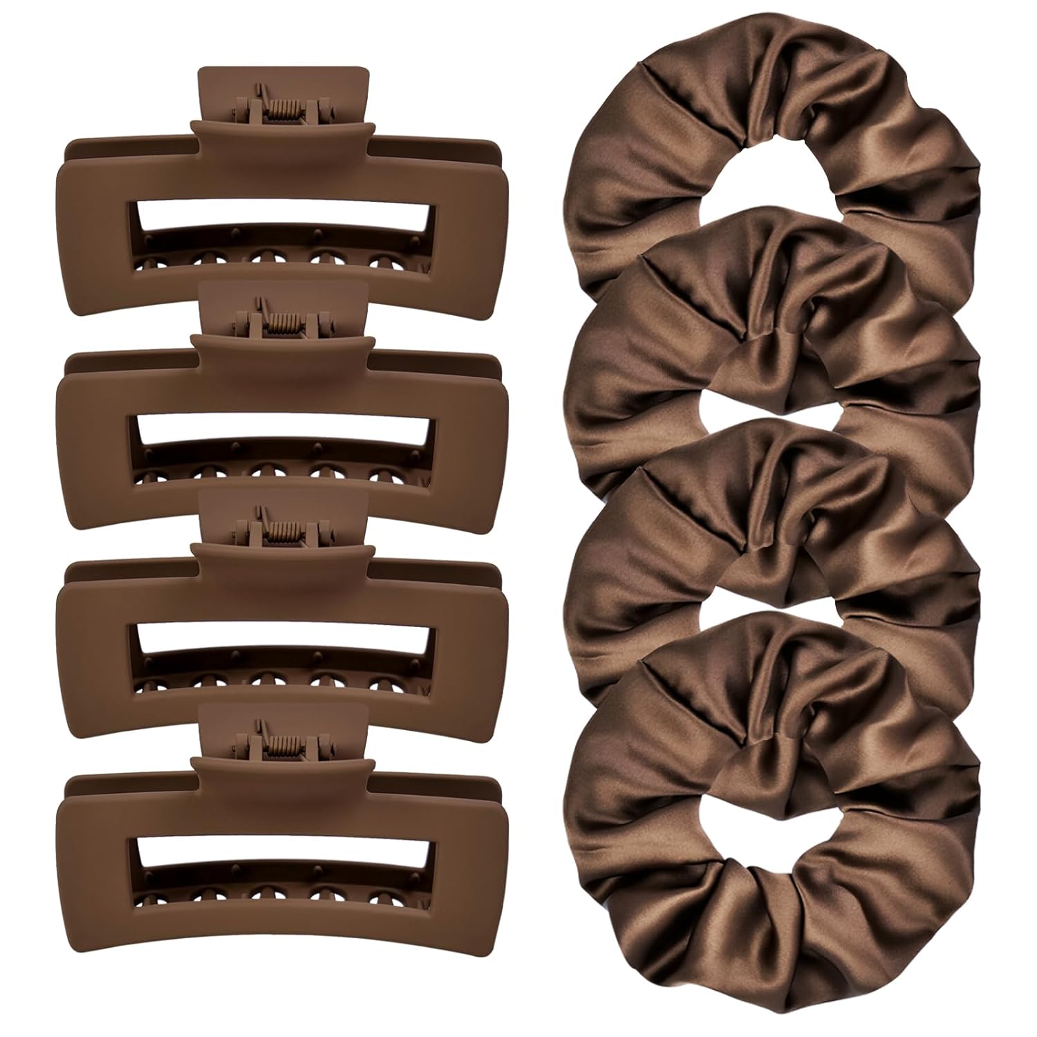 - 8-Piece Brown Hair Set: Includes 4 claw clips and 4 satin scrunchies in coffee color, suit for fall whinter daily outfits