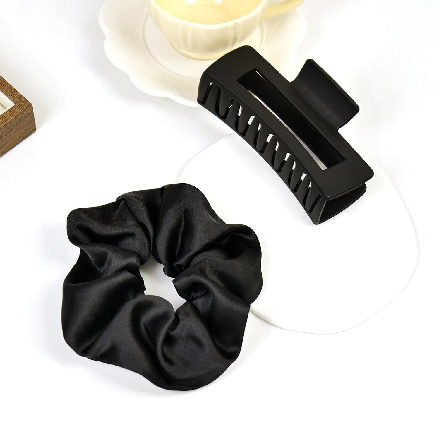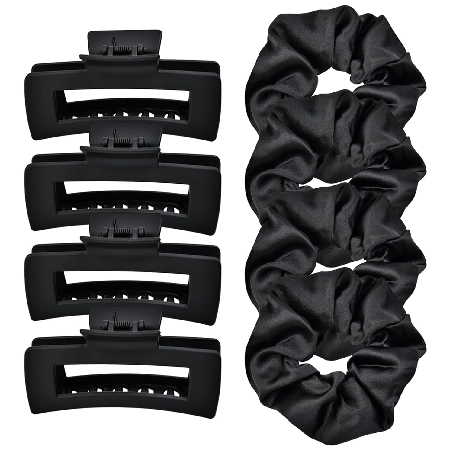 - 8-Piece Black Hair Set: Includes 4 matte clips + 4 satin scrunchies with classic black shades. Creates quick styles for school/workouts/daily routines