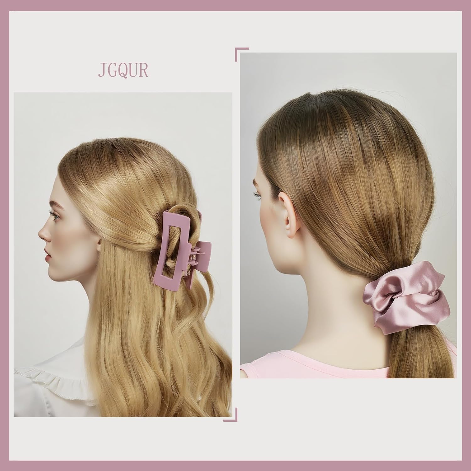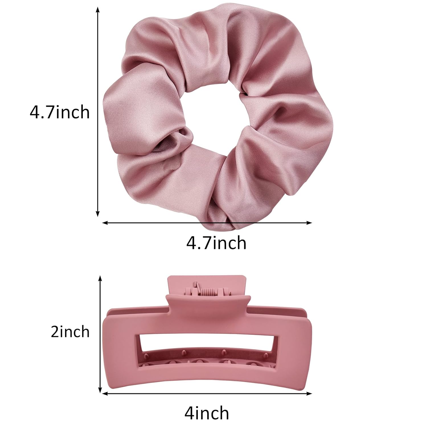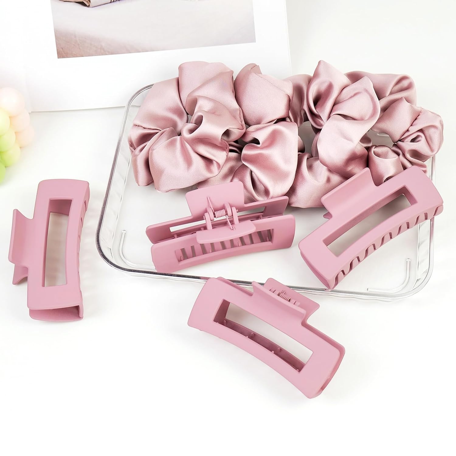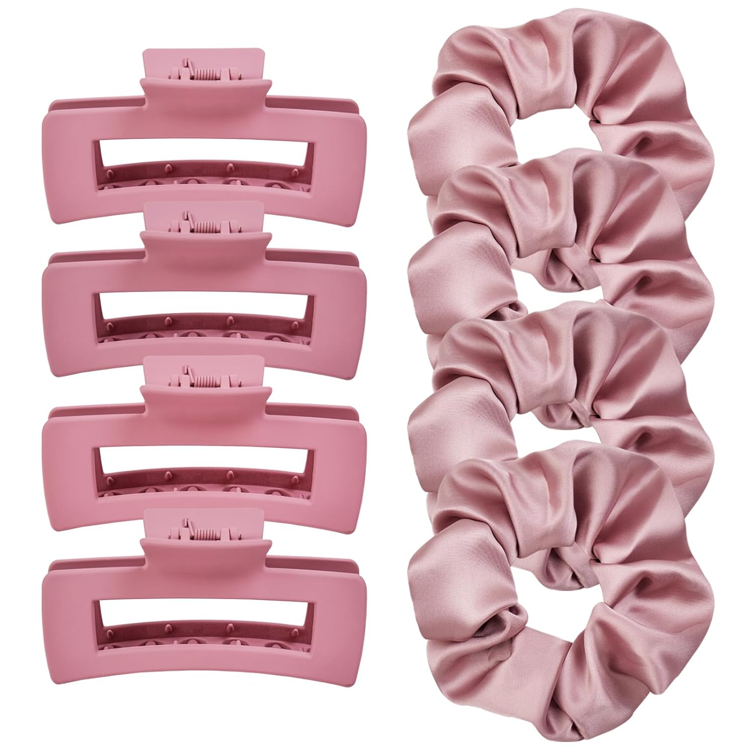 8 Pcs Pink Claw Clips and Hair Scrunchies Set – Square Hair Clips for Women, Medium Non-Slip Matte, Large Satin Scrunchies, Hair Accessories for Thick Thin Hair, Party, Daily Use – Dusty Rose