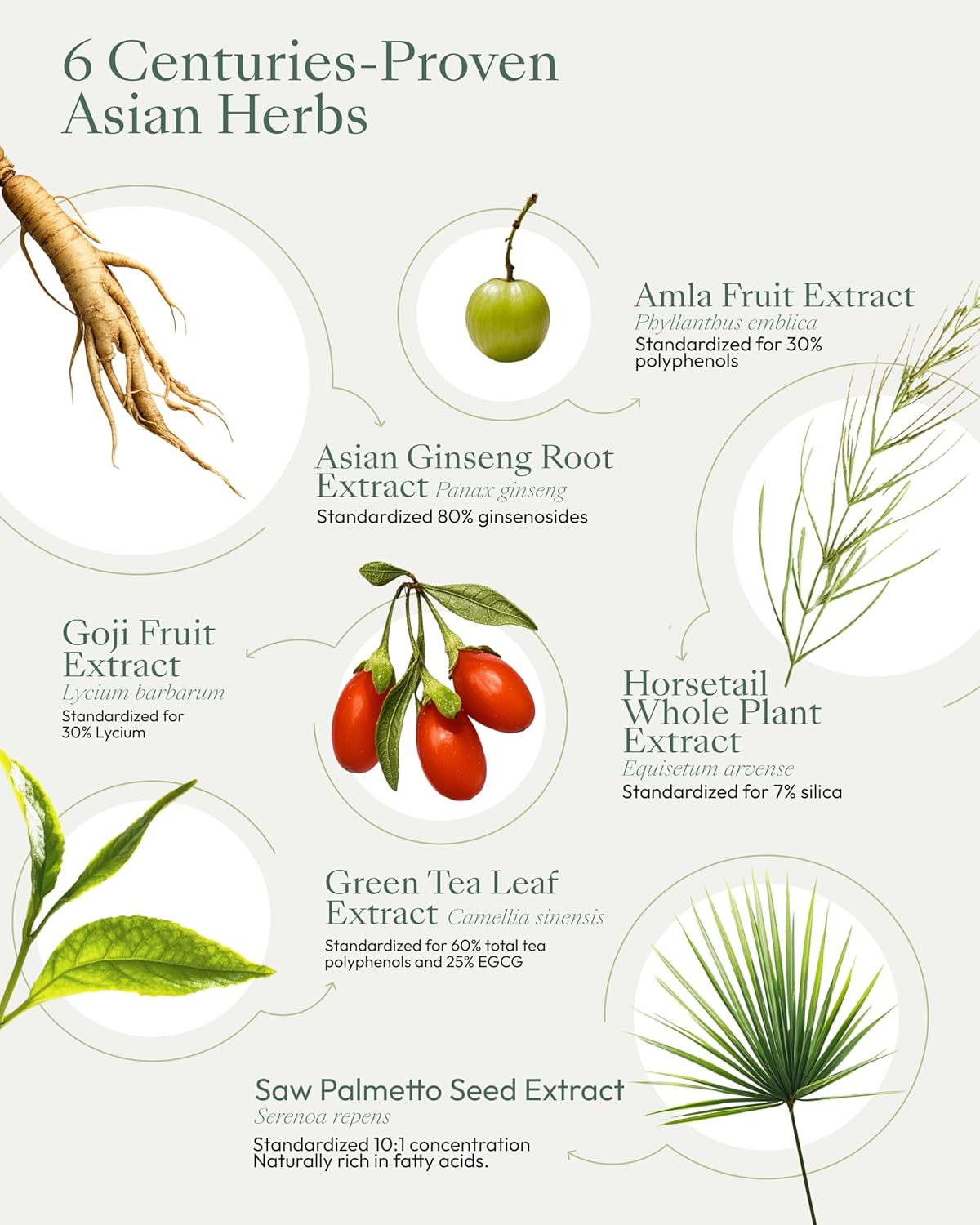 - Herbal Blend for Hair Growth – Includes ginseng, amla, and saw palmetto to help reduce shedding and support fuller-looking hair. Our gummies may have a slight herbal aftertaste, as we place a high value on our formulations. We don't use any artifical flavors or sweeteners, so you can feel confident in what you put in your body.