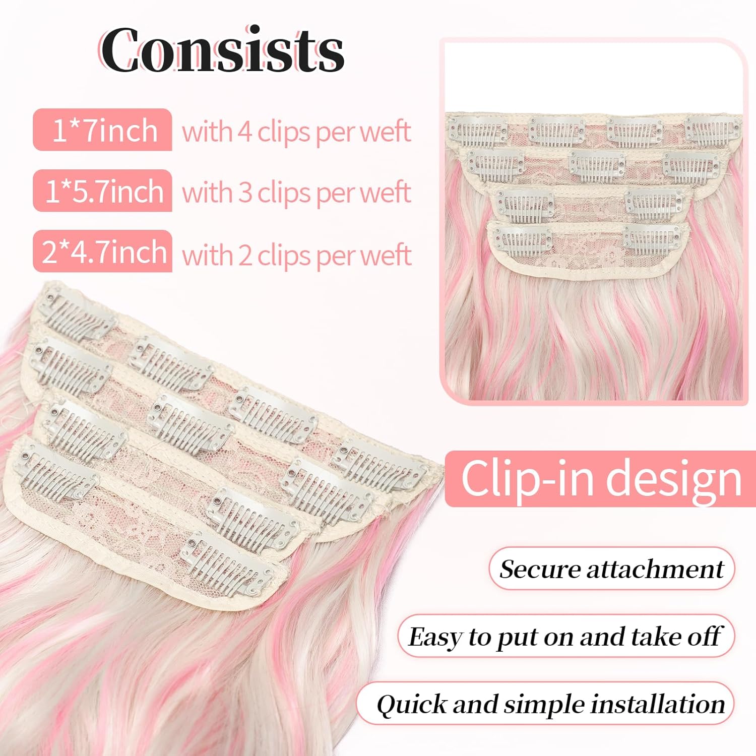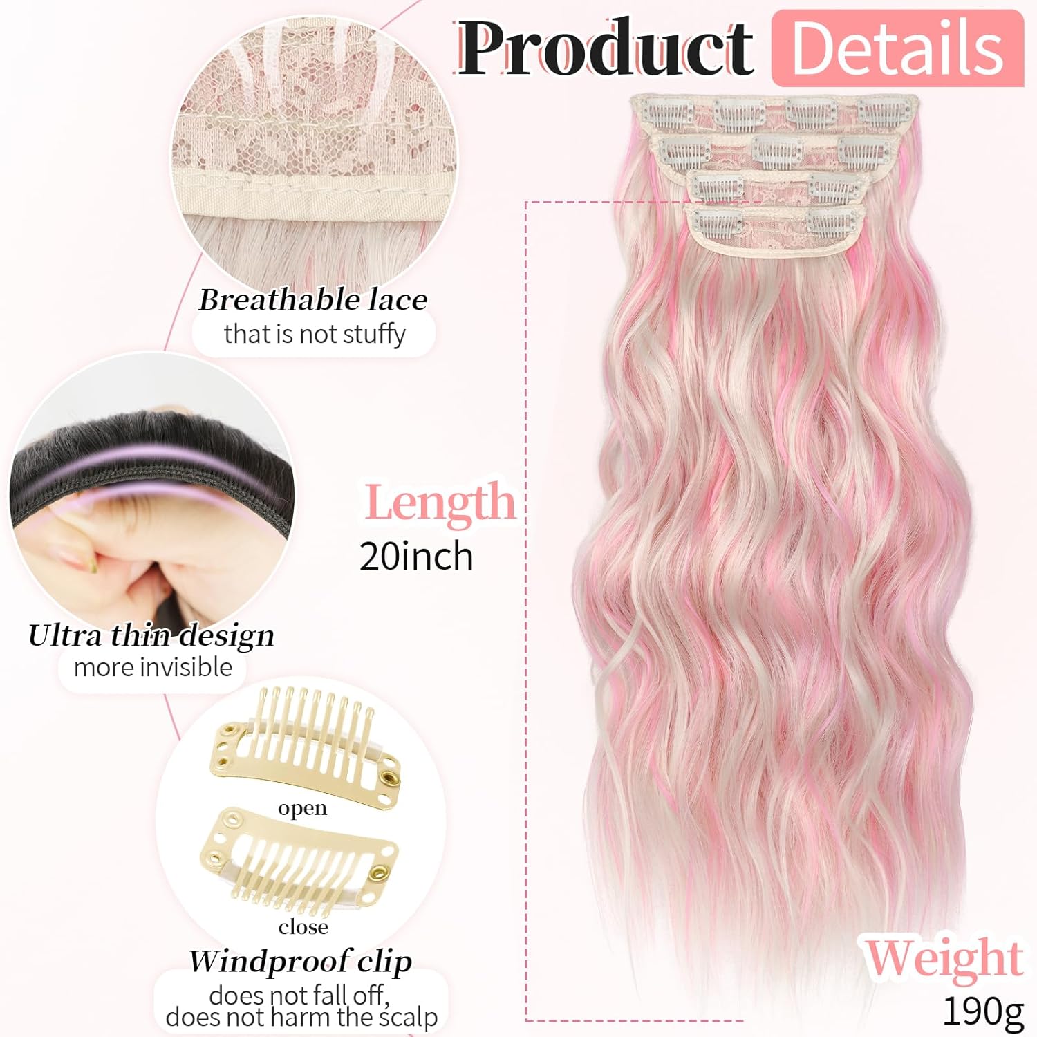 KooKaStyle Clip in Synthetic Hair Extensions Long Wavy 4PCS Thick Hairpieces Blonde with Pink Highlight Fiber Double Weft Natural Hair Extensions 20 Inch for Women