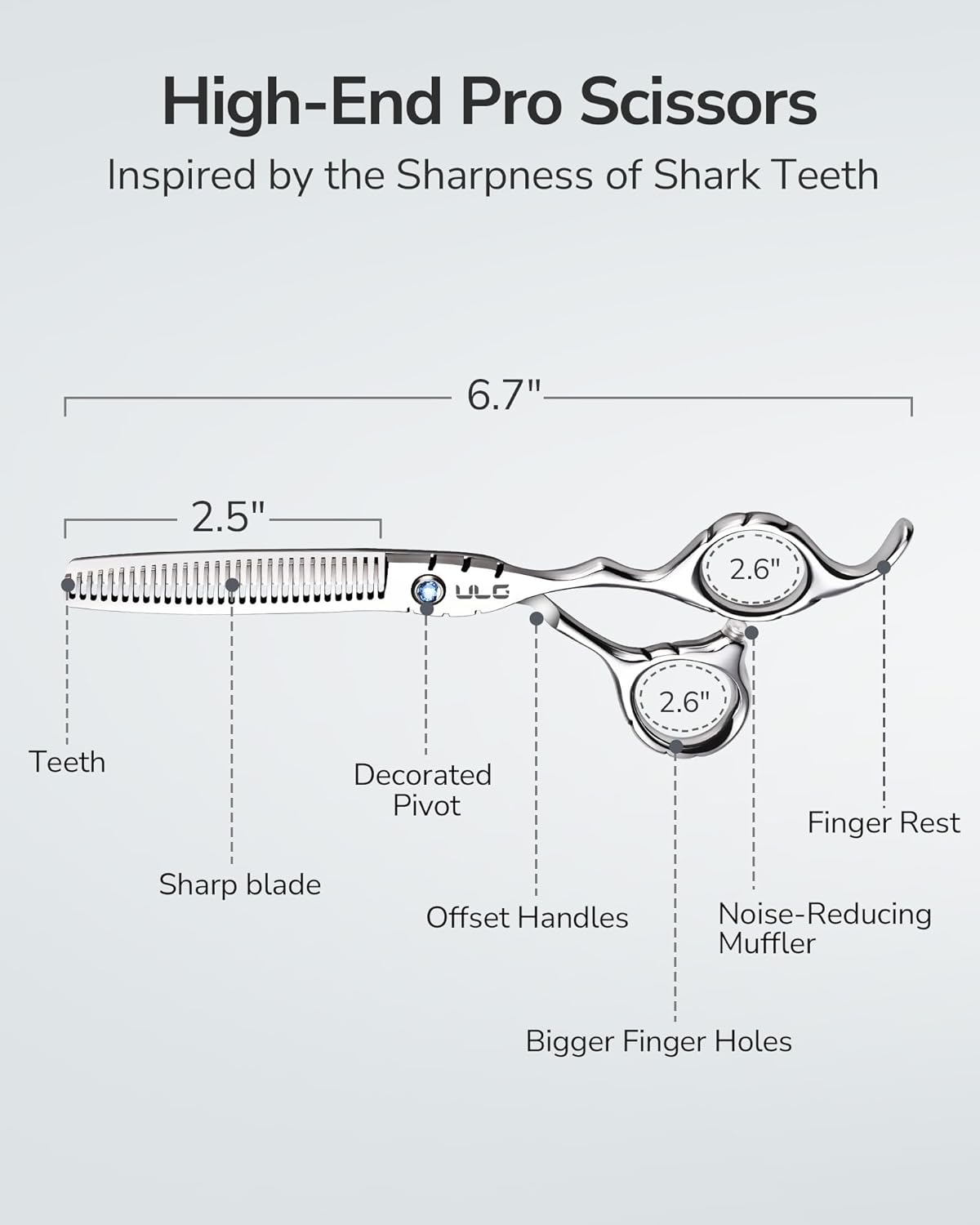 ULG Hair Thinning Scissors 6.7” Shark Series 100% Japanese Stainless Steel, Offset Handle, 30-Tooth Seamless Thinner 15% Hair Removal, Professional Barber Layering Shears for Salon & Home Hair Styling