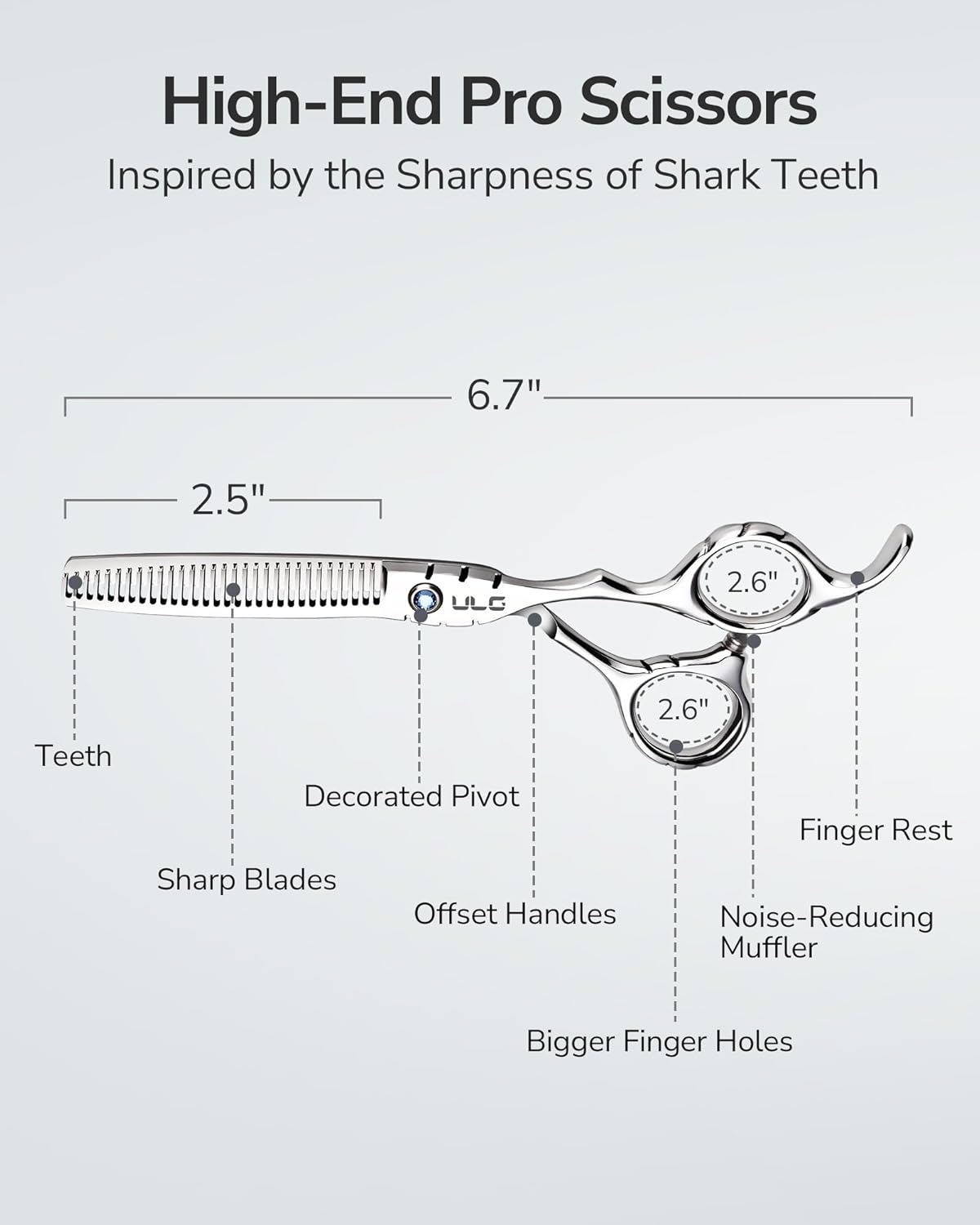 ULG Hair Thinning Scissors 6.7” Shark Series 100% Japanese Stainless Steel, Offset Handle, 30 V-Tooth Thinner 25% Hair Removal, Professional Barber Layering Shears for Salon & Home Hair Styling