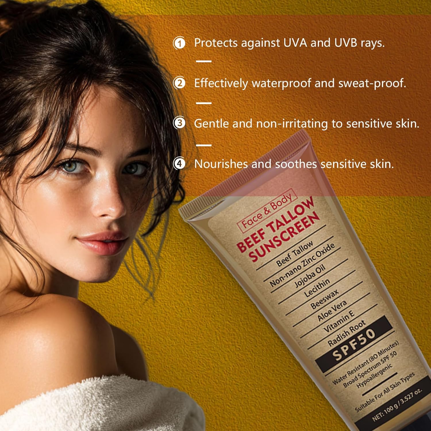 Beef Tallow Sunscreen for Face & Body, Natural Organic Sunscreen SPF 50, Beef Tallow for Skin Non Greasy, No White Cast, Fast Absorbing, Deep Moisturizing for Sensitive Skin, Summer Outdoor, 3.52 OZ