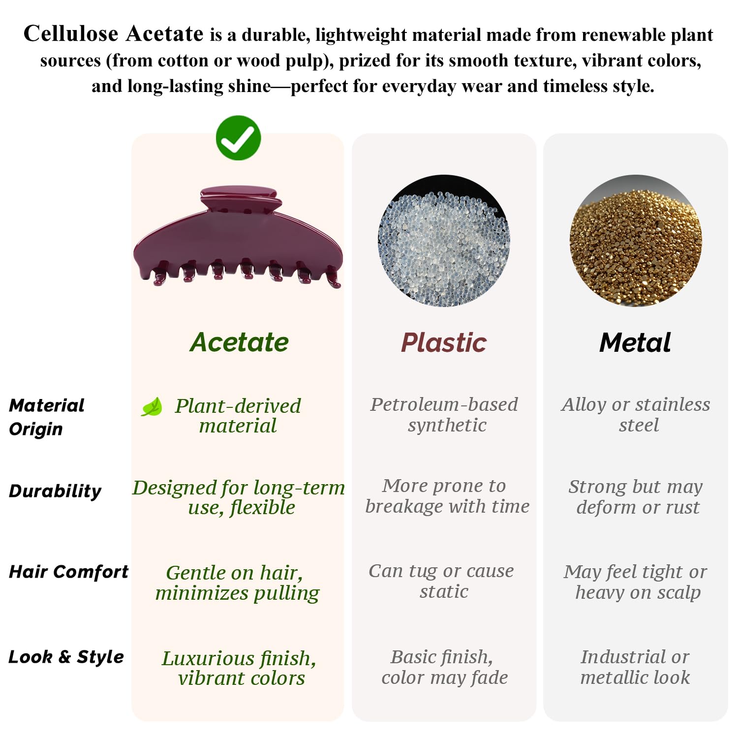 - PREMIUM ACETATE MATERIAL: Made from high-quality plant-derived Cellulose Acetate, this claw clip is more flexible and longer-lasting than regular plastic clips. Known for its smooth texture and gentle feel on hair, it offers a refined, everyday alternative to petroleum-based plastics