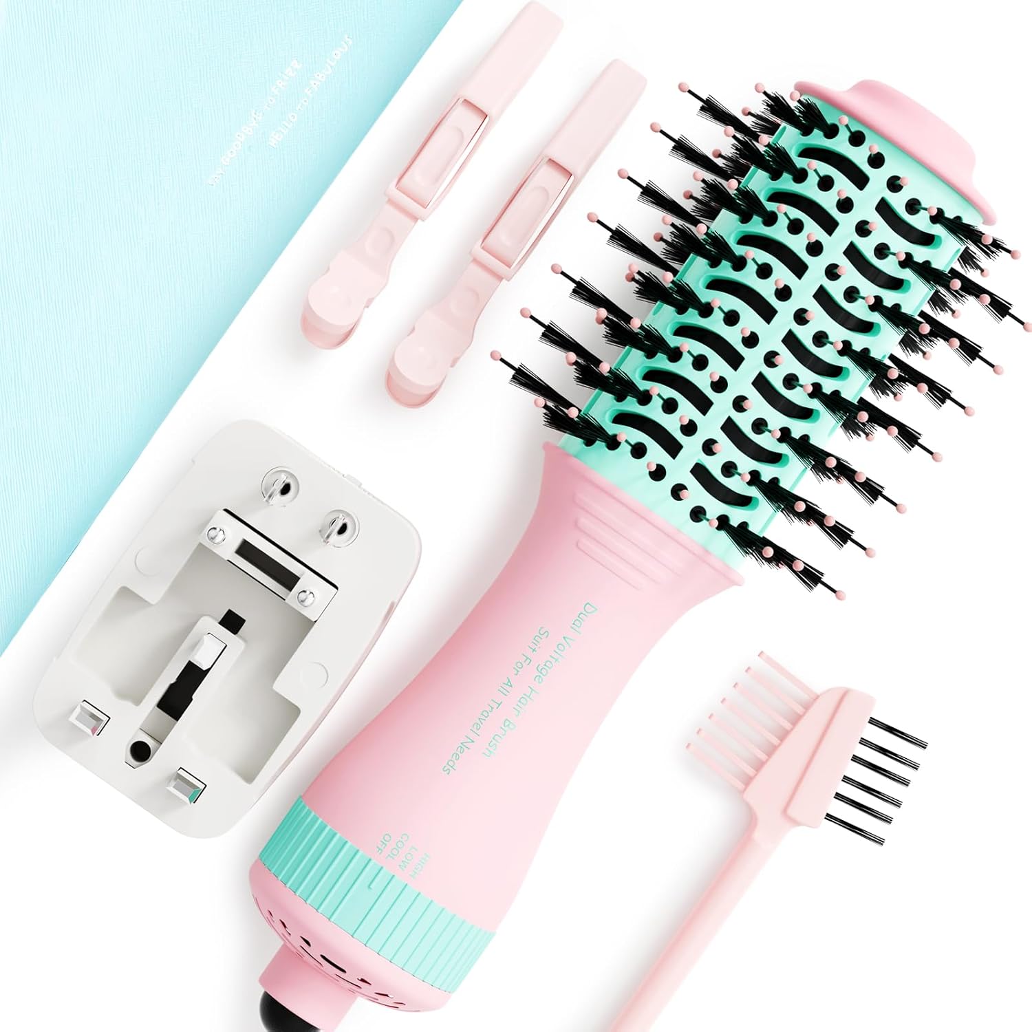 Dual Voltage Travel Dryer Styler in One, 2 Inch Oval Jet Brush for Worldwide Use, 110-240V European Hair Dryer & Volumizer with Universal Adapter