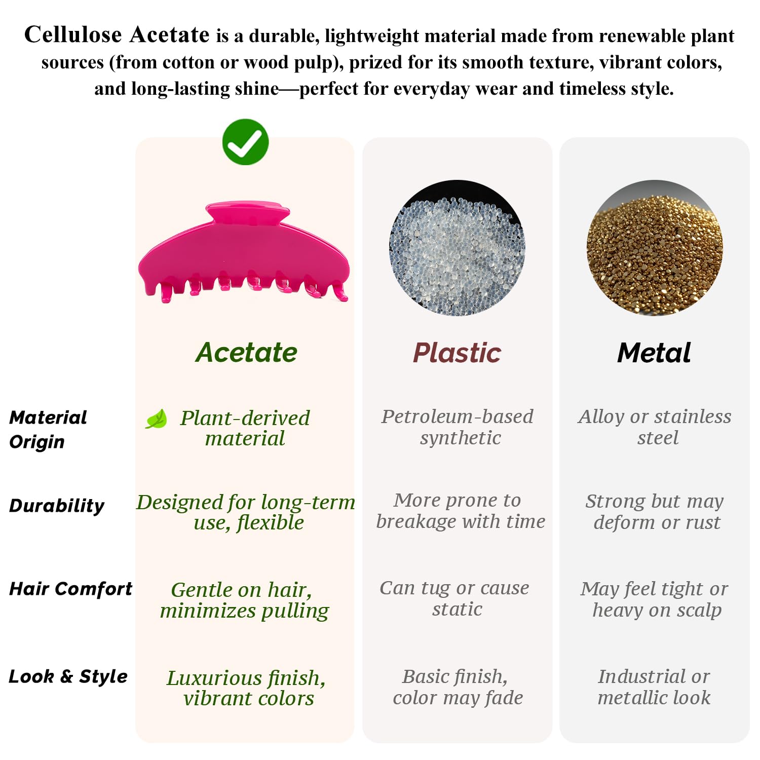 - ✅ Premium Acetate Material: Crafted from high-quality acetate derived from natural plant fibers, this cute claw clip offers a glossy finish and smooth texture that’s durable, lightweight, and gentle on hair