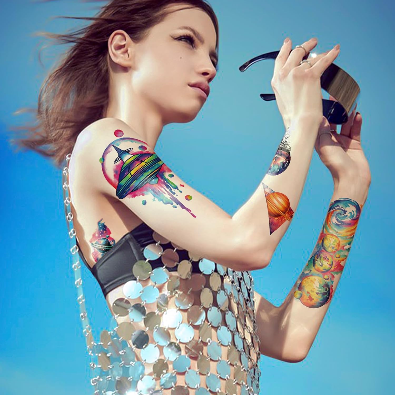 77 Sheets Temporary Tattoos, 17 Sheets Space Planet Astronaut Rockets Half Arm Fake Tattoo for Adults Men Women, 60 Sheets Small Waterproof Lasting Stickers Tattoo for Boys Girls Kids Party