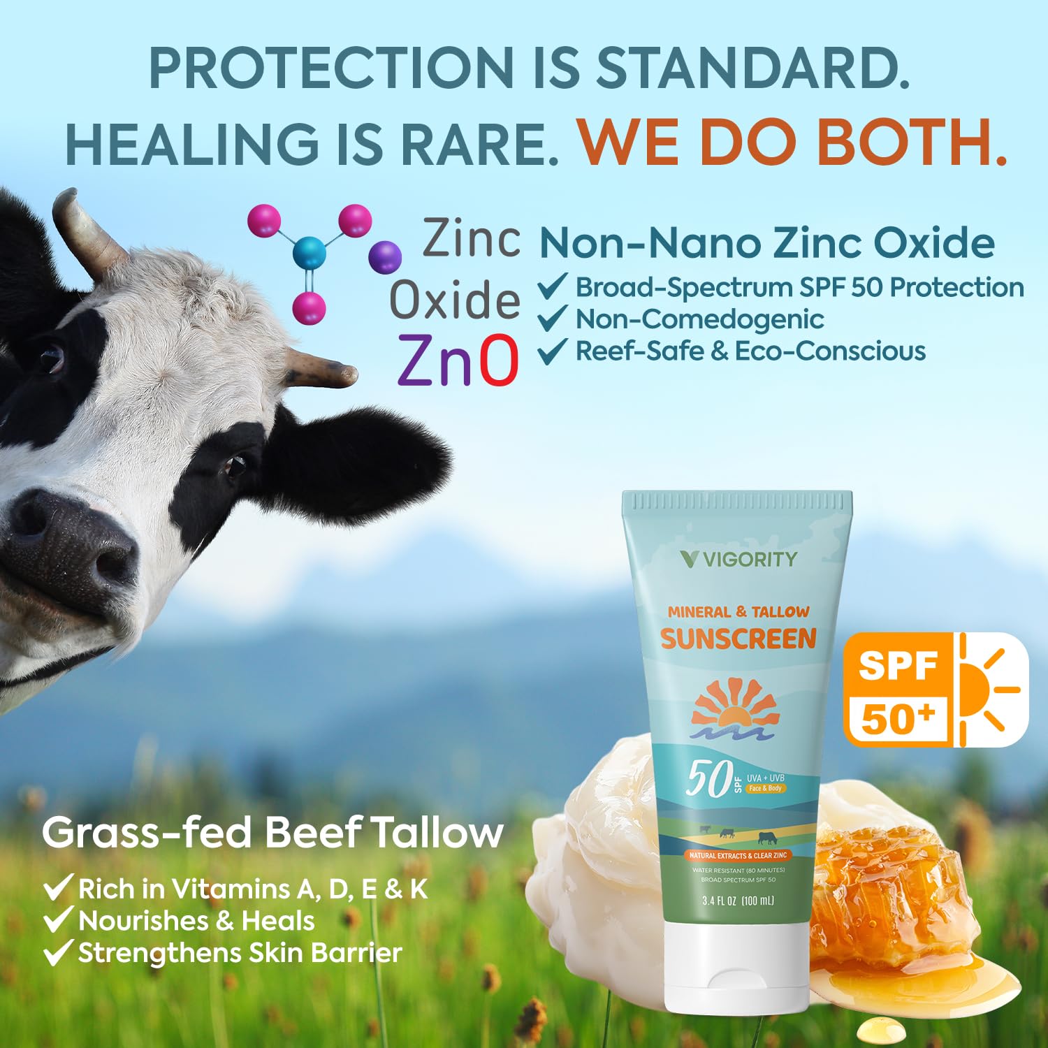 - Natural Non Toxic Sunscreen with Tallow & Zinc: Formulated with Non-Nano Zinc Oxide and nutrient-rich Beef Tallow, this SPF 50 mineral sunscreen provides Broad-Spectrum UVA/UVB protection without harsh chemicals or irritants.