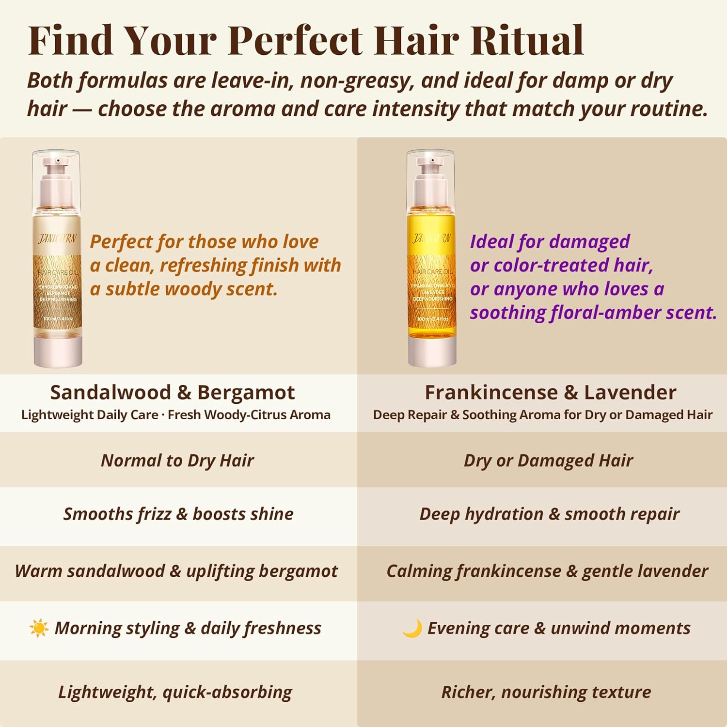 Hair Oil for Dry, Damaged Hair – Lightweight Leave-In Formula with Jojoba & Argan Oils for Deep Hydration, Frizz Control & Pre-Styling Care, Frankincense & Lavender Aroma, 3.4 fl oz / 100 ml