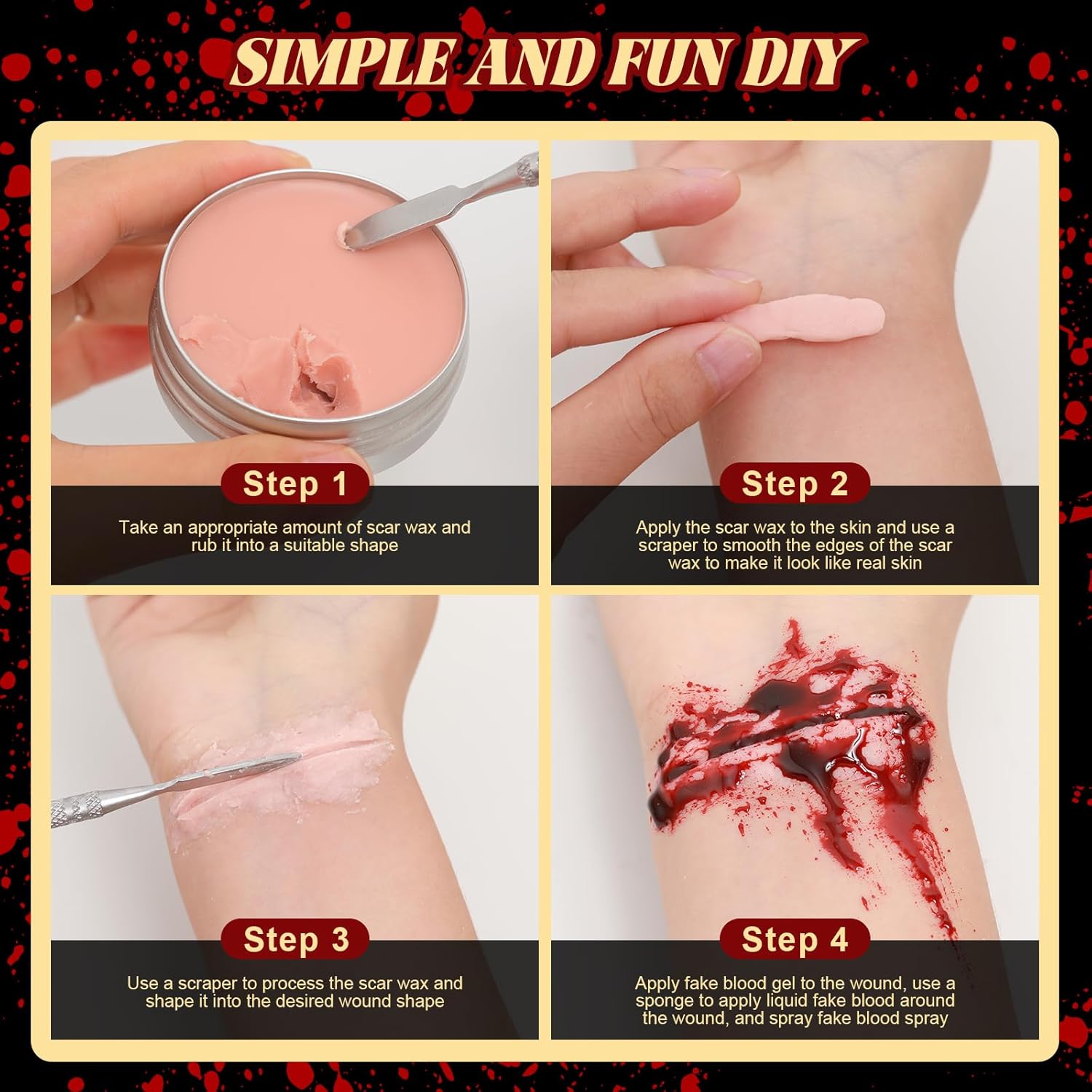 - π Realistic Horror Effects β Easily craft lifelike wounds and scars with scar wax, then finish your look with dark blood gel or spray. Create movie-quality cuts, bruises, burns, bullet holes, and scars that will shock and scare at any event. Ideal for zombies, vampires, clowns, monsters, and other spooky characters.