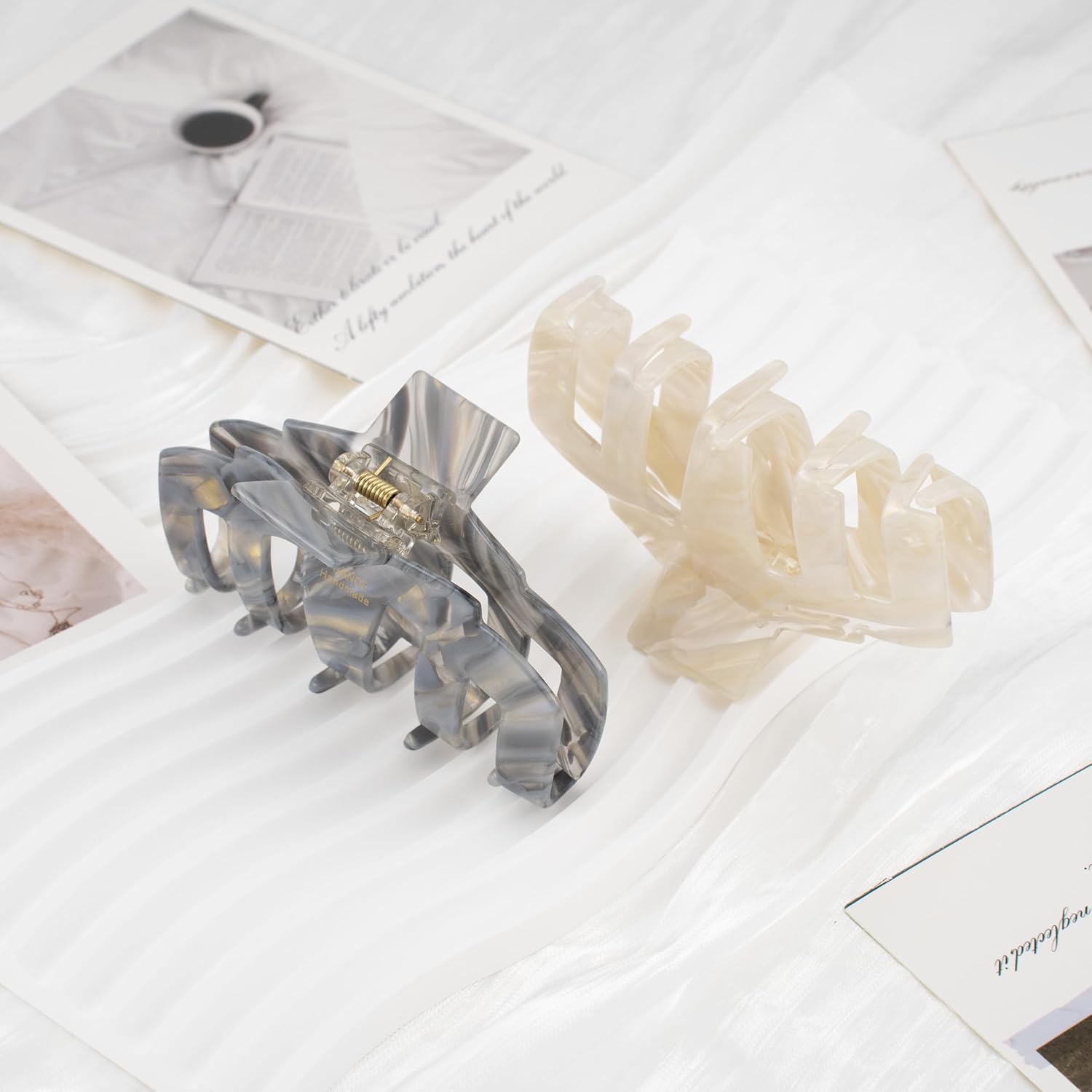 2 Pack French Handmade Marble Acetate Claw Clips, Cream & Gray Large Hair Claw Clips for Thick Hair, Luxury Hair Accessories