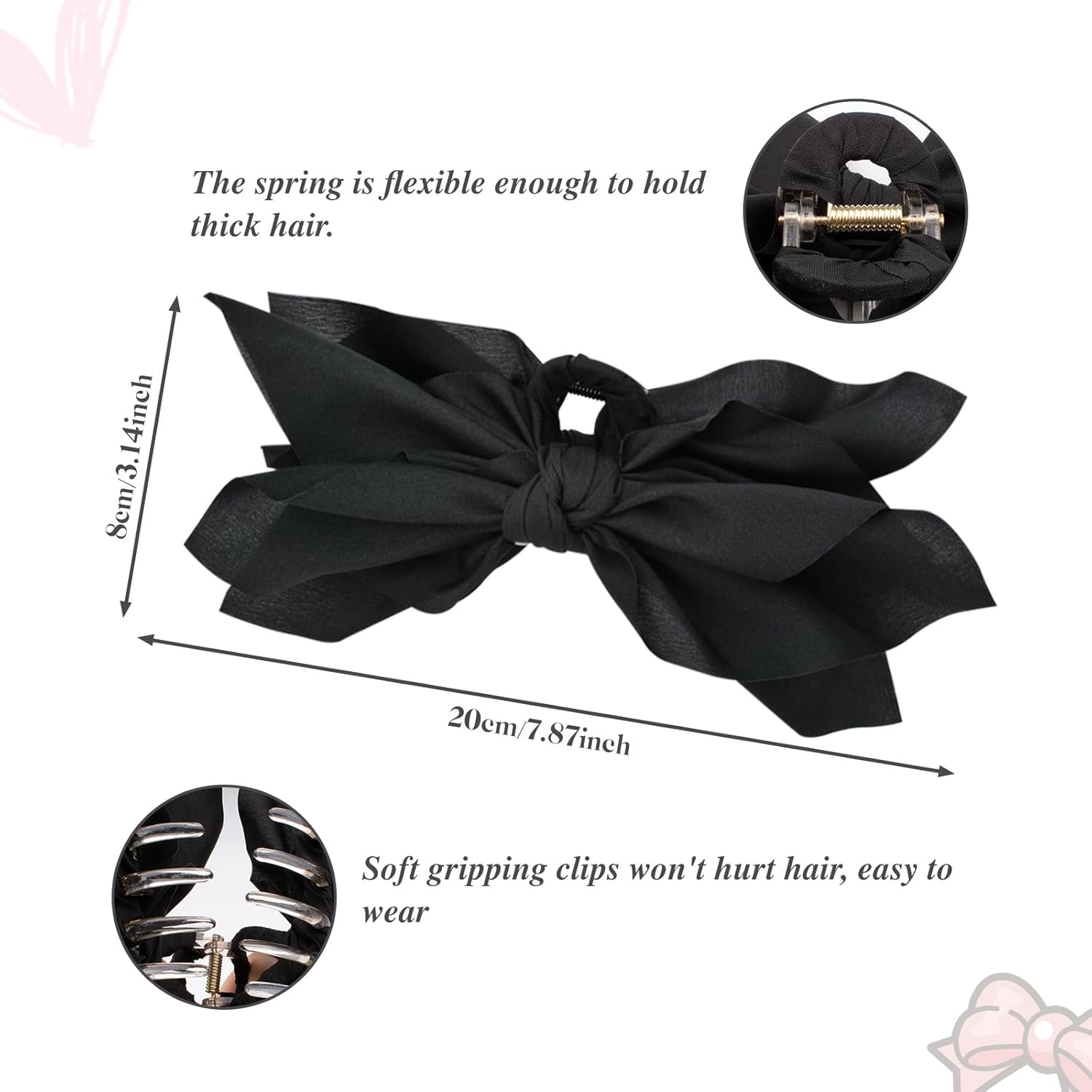 - Non-Slip Hair Clip: These bow hair clips for women measure 7.87 inches in length and 3.14 inches in height. Hadutrek bow claw clips offer the perfect size for comfortably securing different hair volumes.