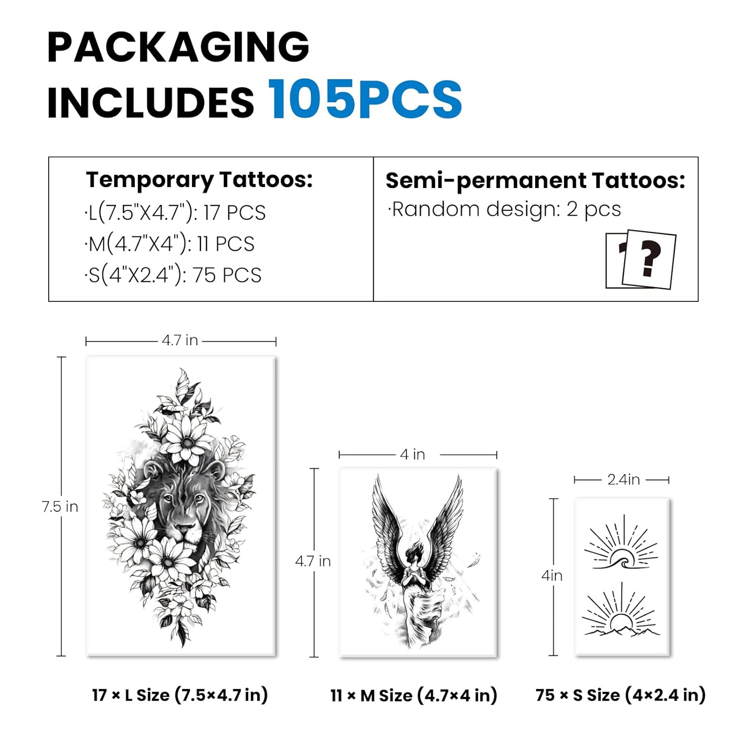 - 【105-Piece Premium Temporary Tattoos Set】This value-packed set includes 103 high-quality body art stickers in 3 sizes (17 Large 7.5"×4.7", 11 Medium 4.7"×4", 75 Small 4"×2.4"). Additionally, it comes with 2 longer-lasting design stickers in random styles.
