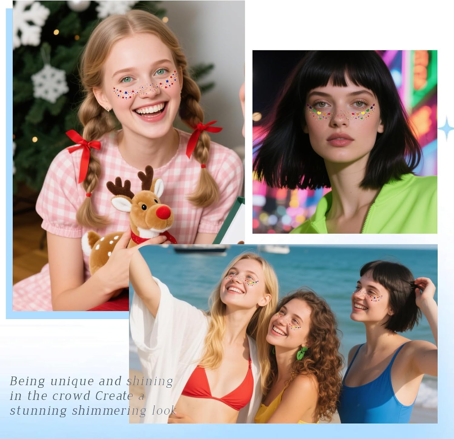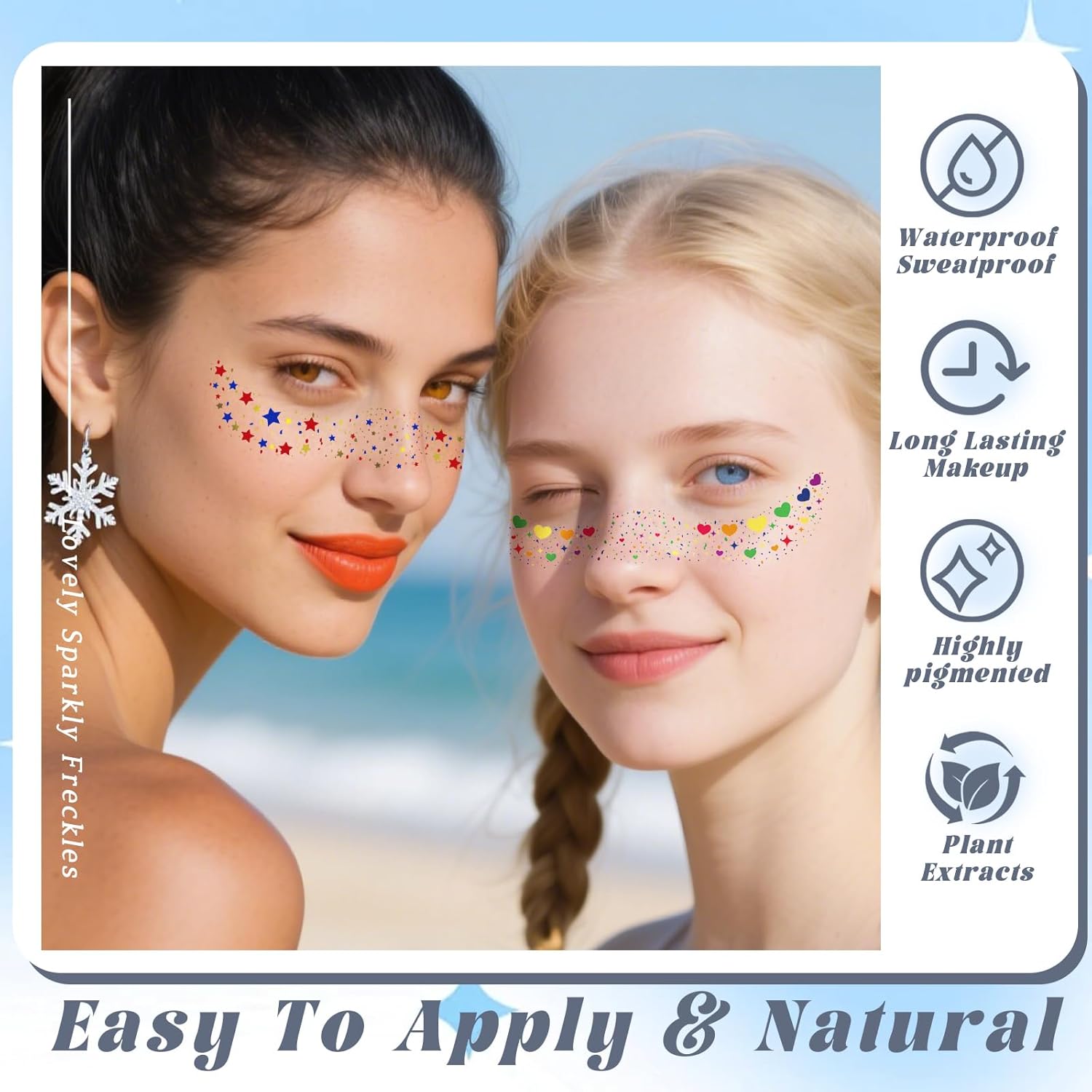 - Easy to Apply: These facial glitter freckle patches are easy to use. All you need to do is peel off the backing, apply the glitter freckle tattoo patch to clean skin, soak it in water, gently press it for tens of seconds, peel off the makeup patch, and the natural glittery design will adhere to your skin