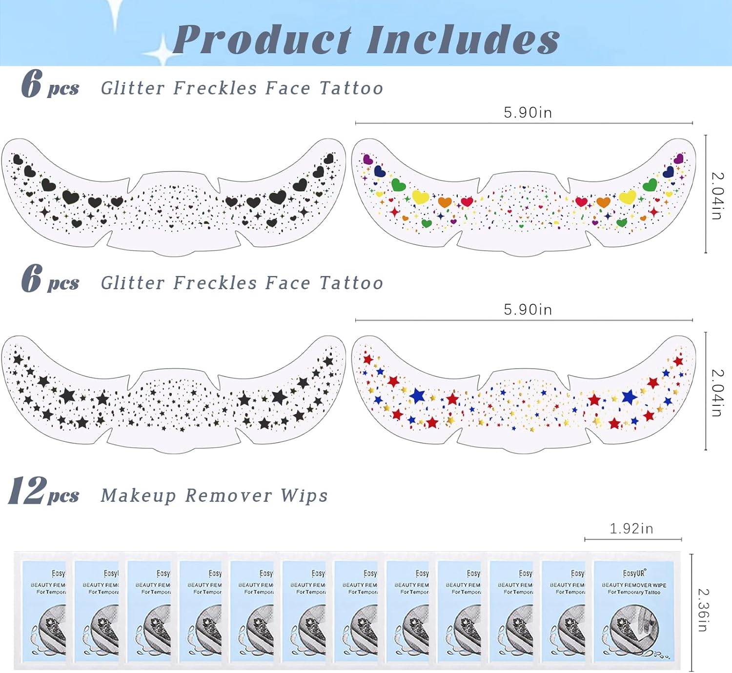 - Complete Kit for Effortless Glam: This set includes 12 vibrant rainbow freckle tattoos and 12 gentle makeup remover wipes. Made with skin-friendly, cruelty-free ingredients, our tattoos are safe even for sensitive skin. Add playful charm to your look without irritation or hassle