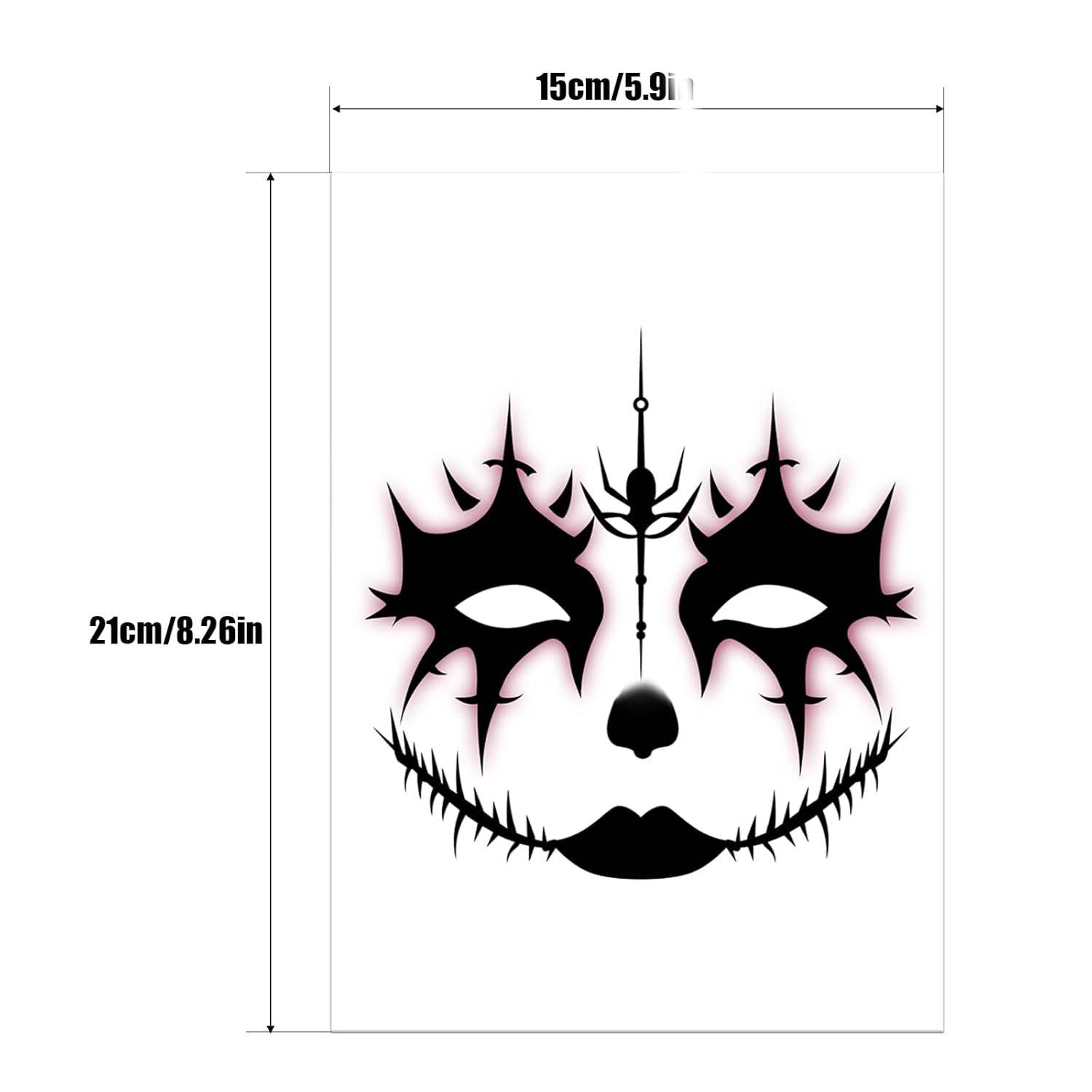 - 【Product Design】Our Halloween makeup tattoos are carefully designed to create the ultimate visual effect. The series includes disturbing details such as jagged spikes radiating around the eye sockets, a stitched mouth, and a spooky spider pattern in the center of the forehead. These unique and exquisite Halloween face tattoos are sure to make a lasting impression at any Halloween costume party and cosplay event.