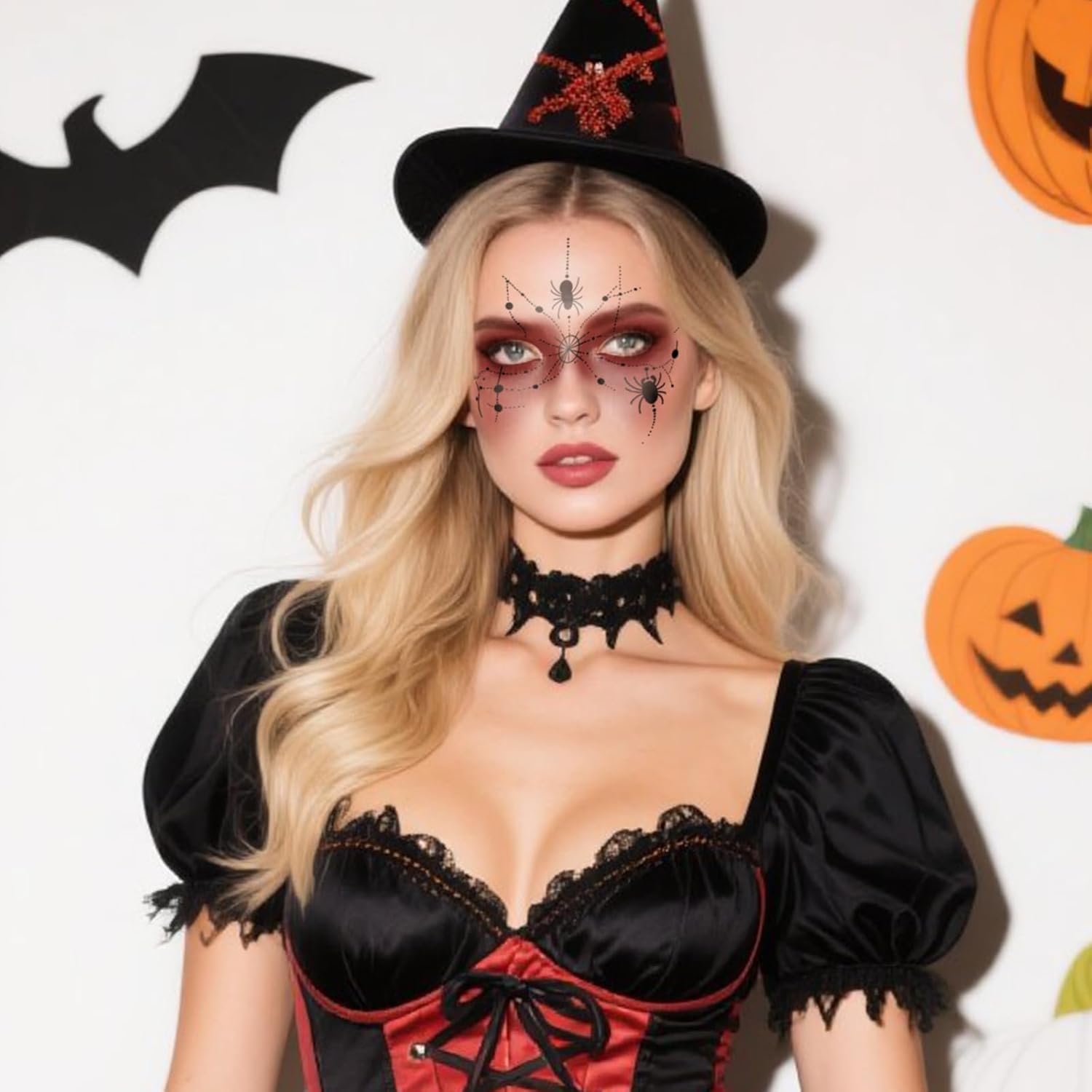 - 【Product Design】These Halloween temporary face tattoos each show a spider weaving a web on the forehead and another spider hanging from around the eye. The pink eye makeup design adds a touch of spooky and charming, ensuring an eye-catching face tattoo at cosplay theme events. No makeup skills required!