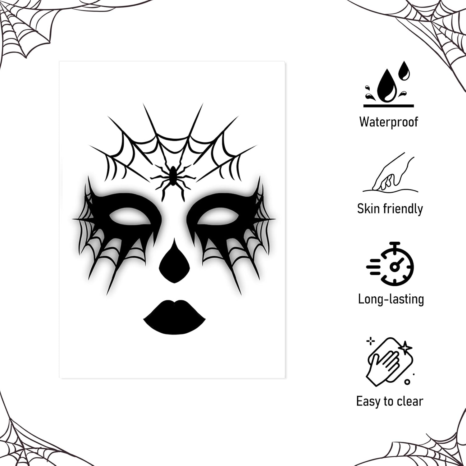 - 【Product Design】Our Halloween face tattoos have a unique and charming aesthetic. The main design element is a striking spiderweb pattern on the forehead with a striking spider in the center, perfectly capturing the essence of Halloween. The charming web pattern extends around the eyes, creating a whimsical yet elegant atmosphere. No need for fussy black makeup.