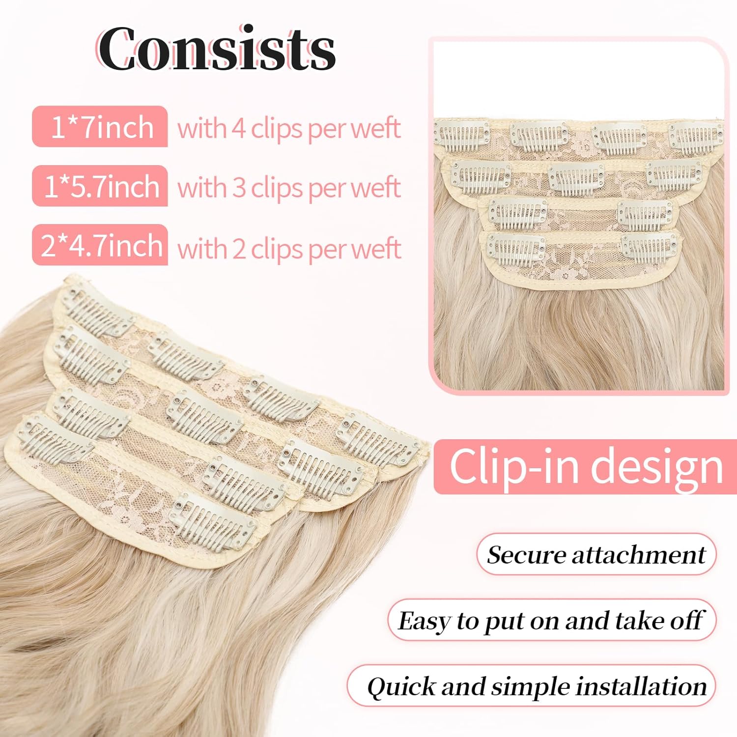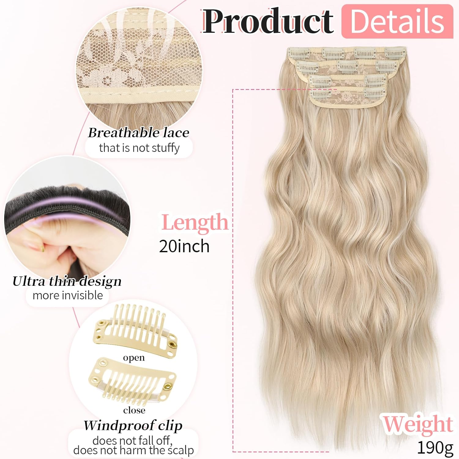 KooKaStyle Clip in Long Wavy Synthetic Hair Extension 20 Inch Pearl Blonde 4PCS Thick Hairpieces Fiber Double Weft Hair for Women