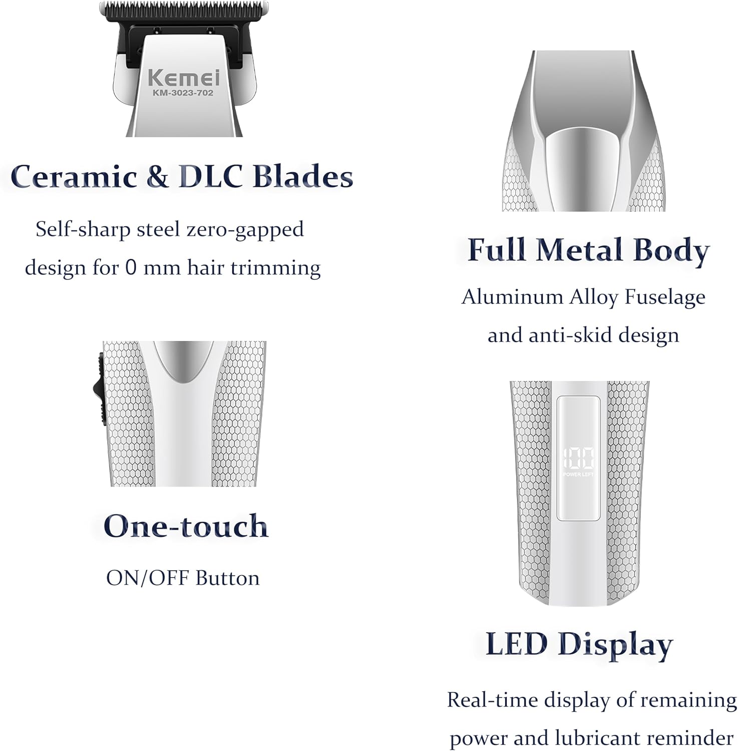 KEMEI 3023-702 Hair & Beard Trimmer for Men, 9000 RPM Zero Gapped Trimmers for Barbers with Full Metal Body, Professional Hair Clippers with LED Display, Ceramic and DLC Blades