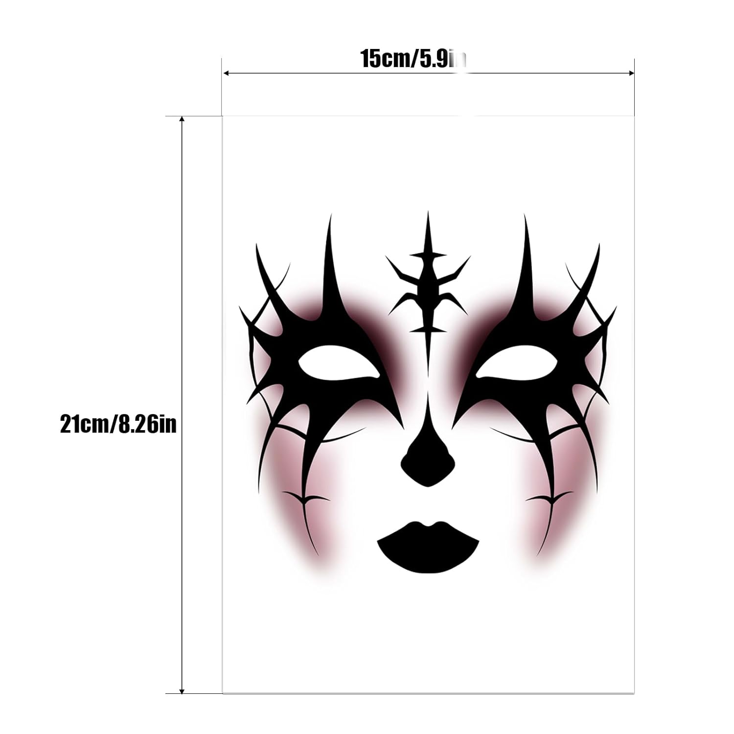 - 【Product Design】Unleash your inner mystic with our unique collection of Halloween face tattoos. The main pattern features sharp and eye-catching "spikes" that extend outward and upward around the eyes, creating a dramatic and aggressive aesthetic. Complementing this, a vertical, elongated, multi-pointed black pattern in the center of the forehead, resembling a star or flame, adds to the mystery and ritual of the mask.