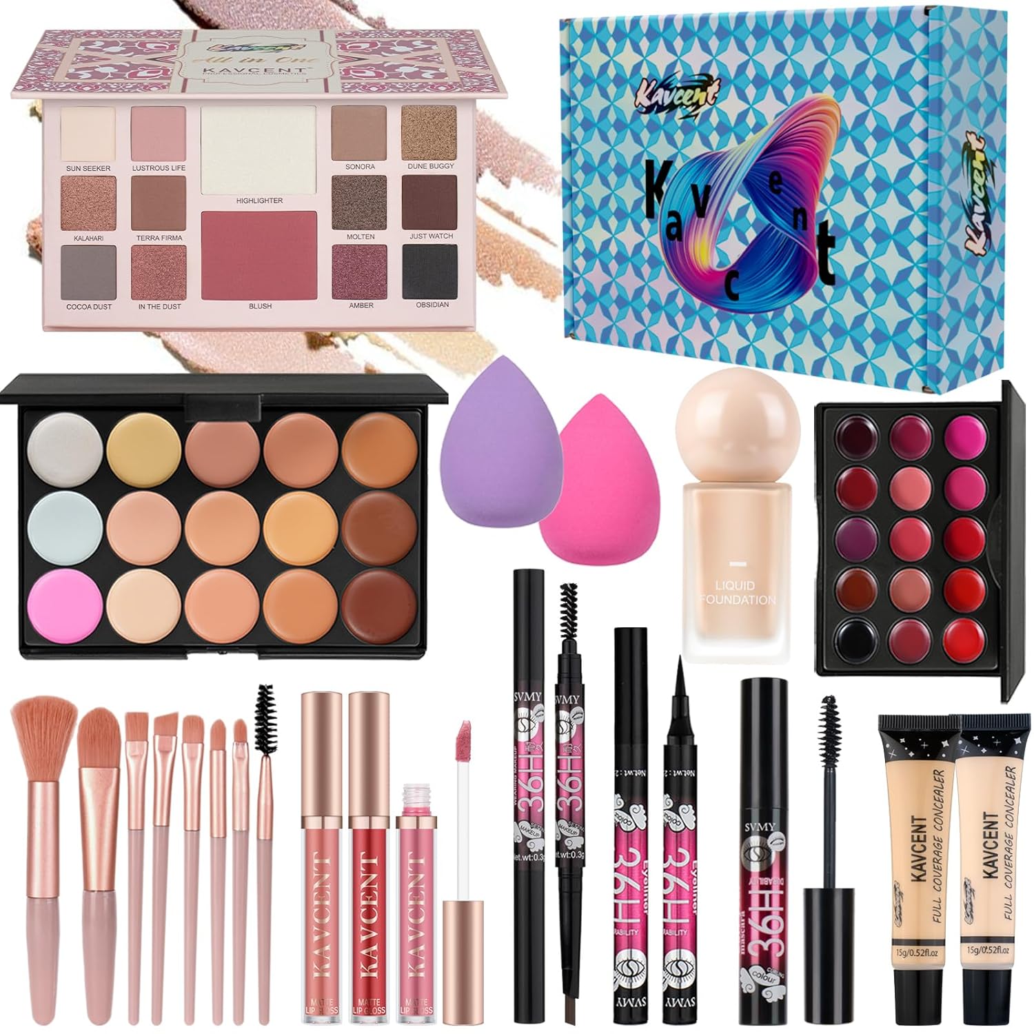 - 【All in One Makeup Kit】This KAVCENT Makeup Gift Set including makeup palette, foundation, concealer palette, lipstick palette, powder puff, lip gloss, concealer, eyeliner, eyebrow pencil, marscara, cosmetic brush and Gift Box