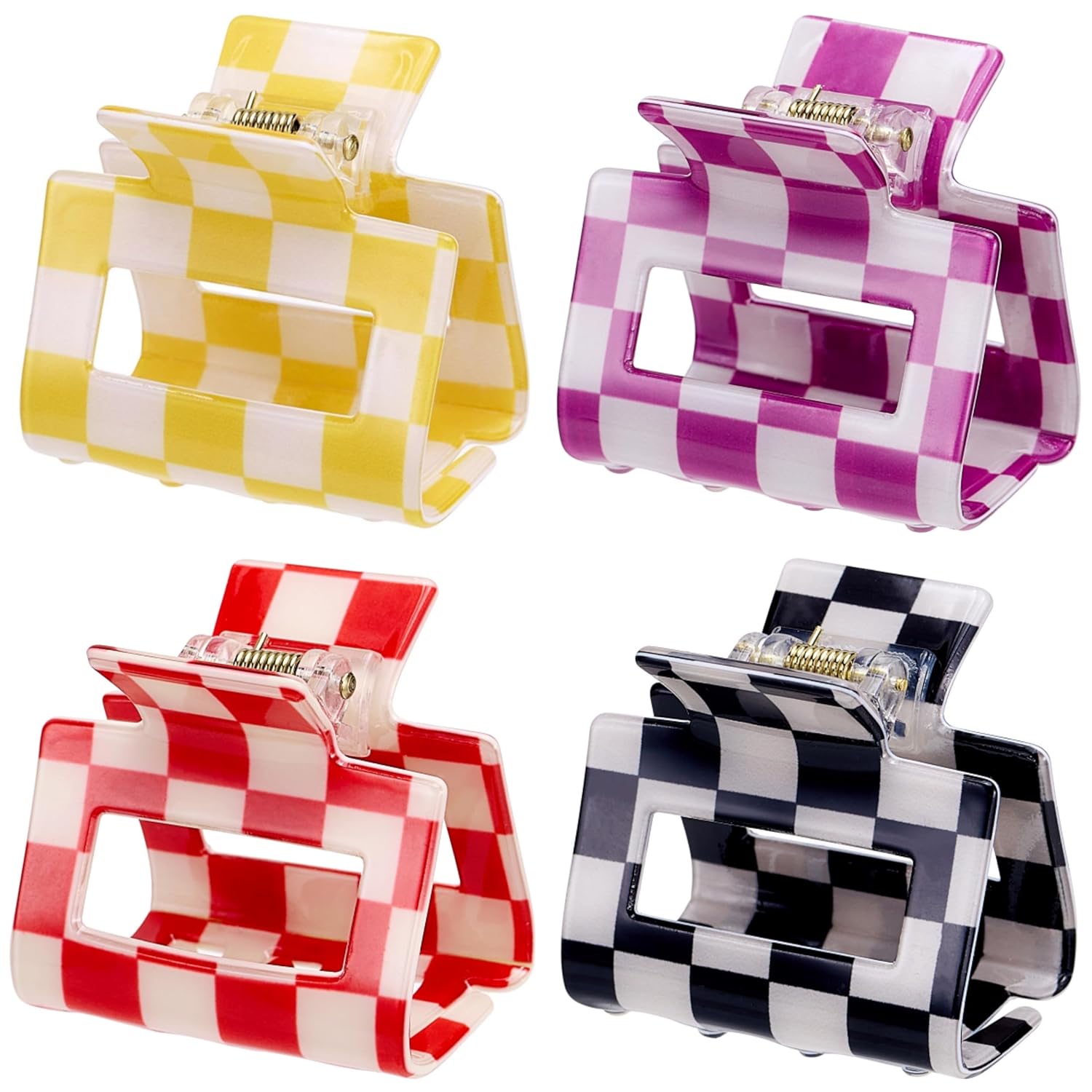 SINIDE Checkered Hair Claw Clips Set, Rectangle Bright Multicolored Square Checker Barrettes for Women Ladies Non Slip Jaw Clip Strong Hold Accessories Acrylic Claw Clamps for Thin Thick Hair (4 Pack)