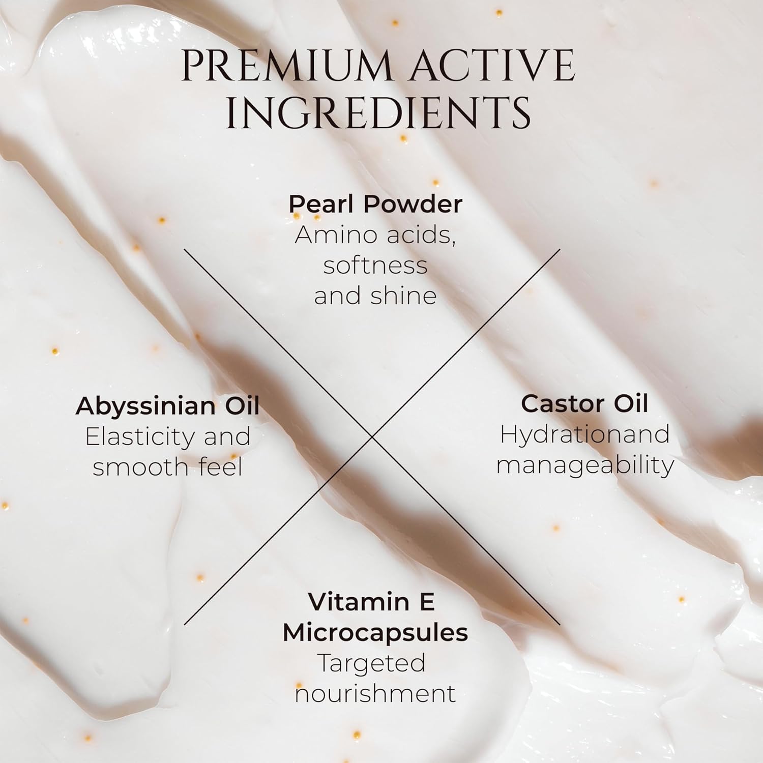 - Nourishing Active Ingredients: Enriched with pearl powder extract, Abyssinian mustard oil, and castor oil, this moisturizing hair mask deeply nourishes, hydrates, and strengthens strands. Amino acids and phytosterols help improve manageability, softness, and shine, leaving hair looking healthy and revitalized.