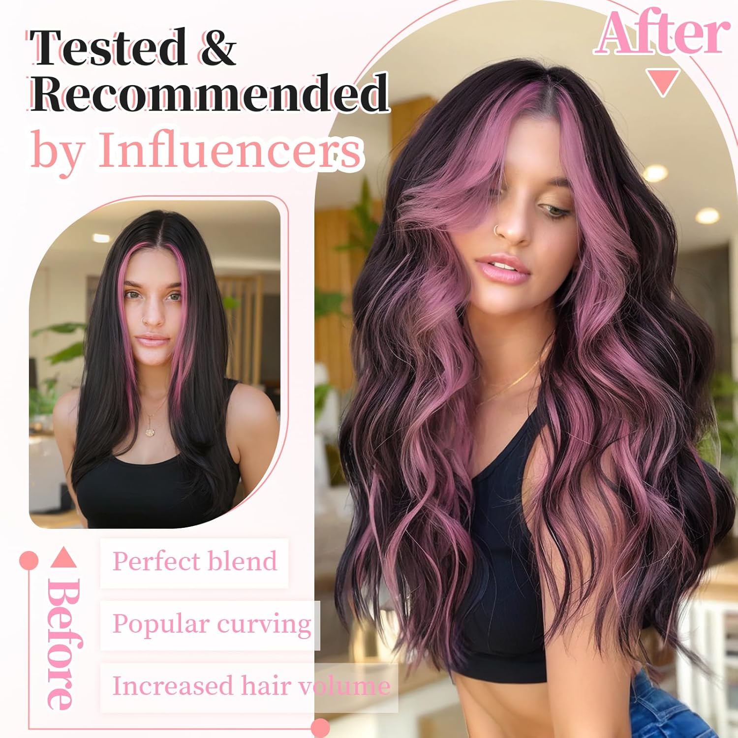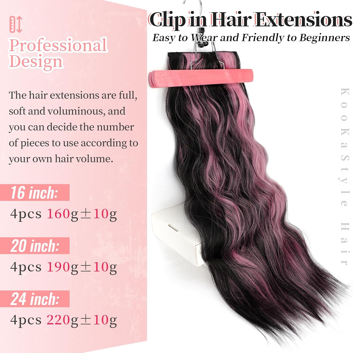 KooKaStyle Clip in Hair Extensions 4PCS Long Wavy Natural & Soft Hairpieces for Women 24 Inch for Women(Natural Black Pink)