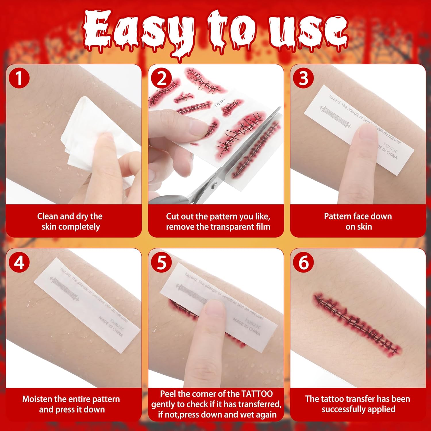 - Easy to Use: Simply cut out your desired pattern, peel off the clear film, and apply it to clean, dry skin. Press the Halloween tattoo with a damp cloth, then remove the white paper to reveal a realistic fake scar. To remove, gently soak zombie tattoo with makeup remover oil, then wash with soap and water.