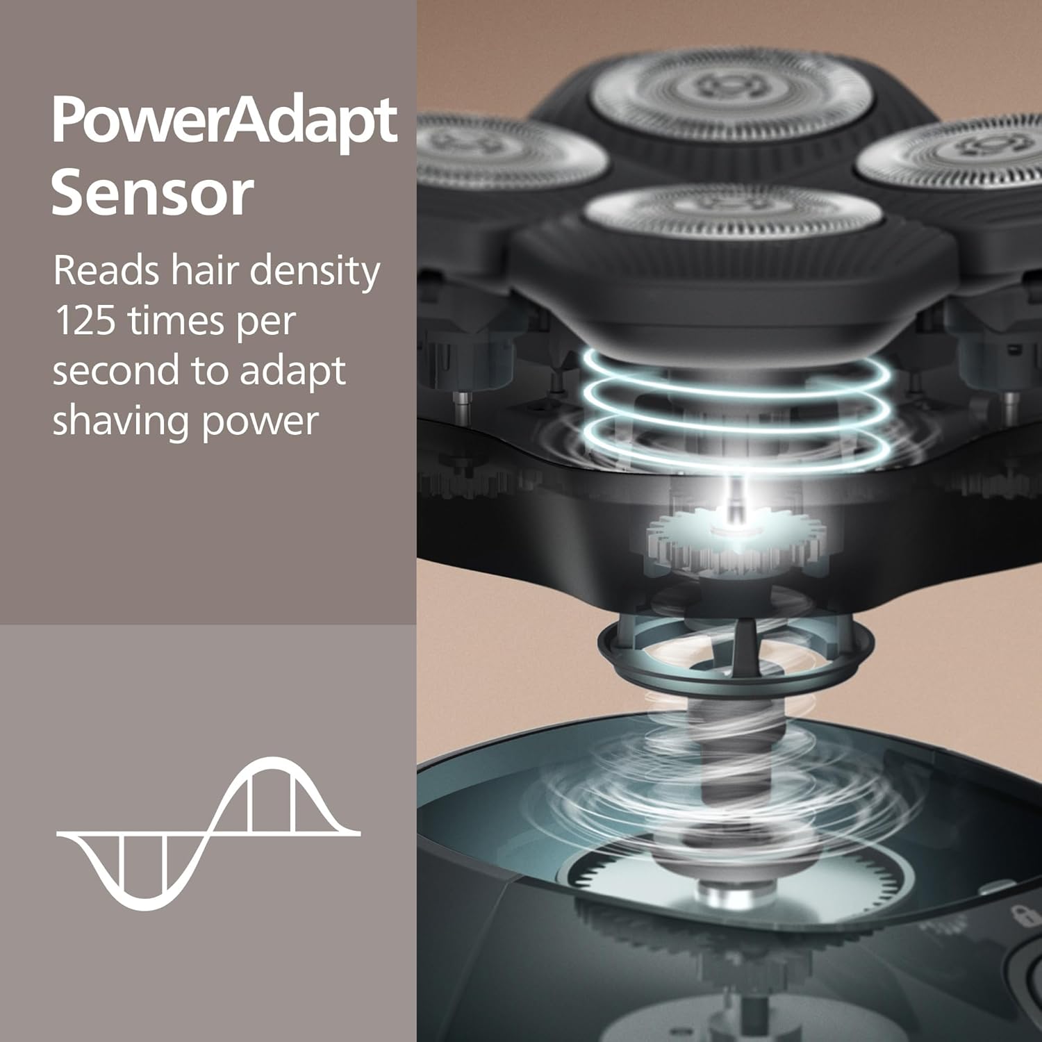 - Ergonomic design helps you keep a secure grip as you shave; PowerAdapt Sensor reads hair density 125 times per second and dynamically adapts shaving power for effortless shaving