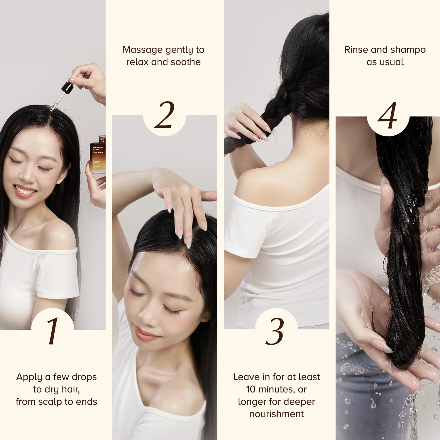 - VERSATILE PRE-WASH OR LEAVE-IN SERUM — Use as a pre-wash hair oil or nightly leave-in treatment. Apply 3–6 drops to the scalp, massage 2–3 minutes and leave for 10 minutes or overnight for deeper nourishment.