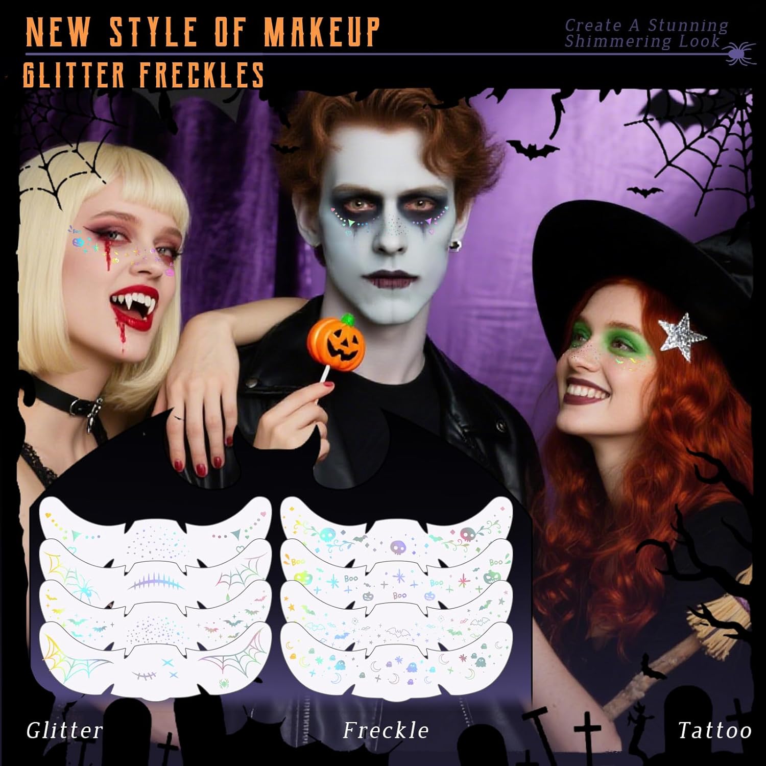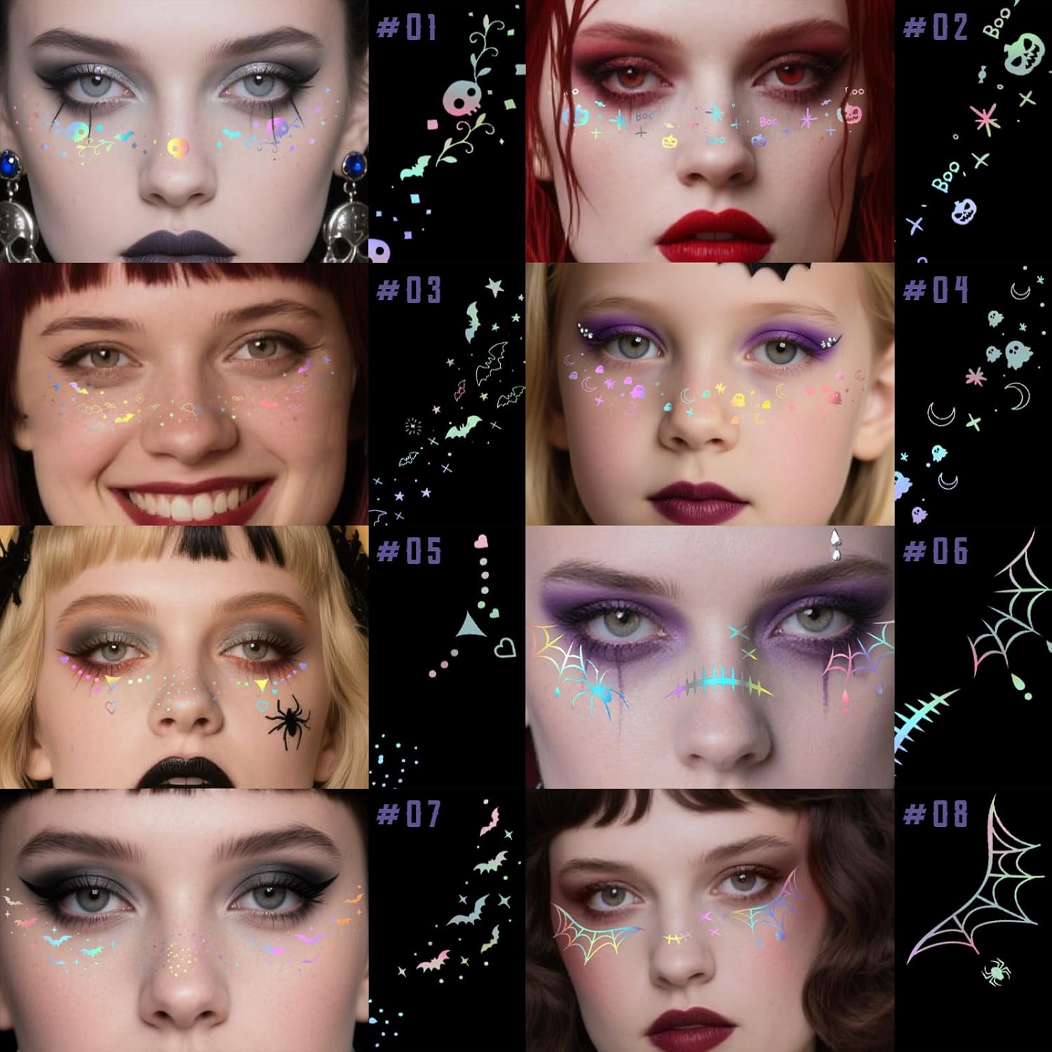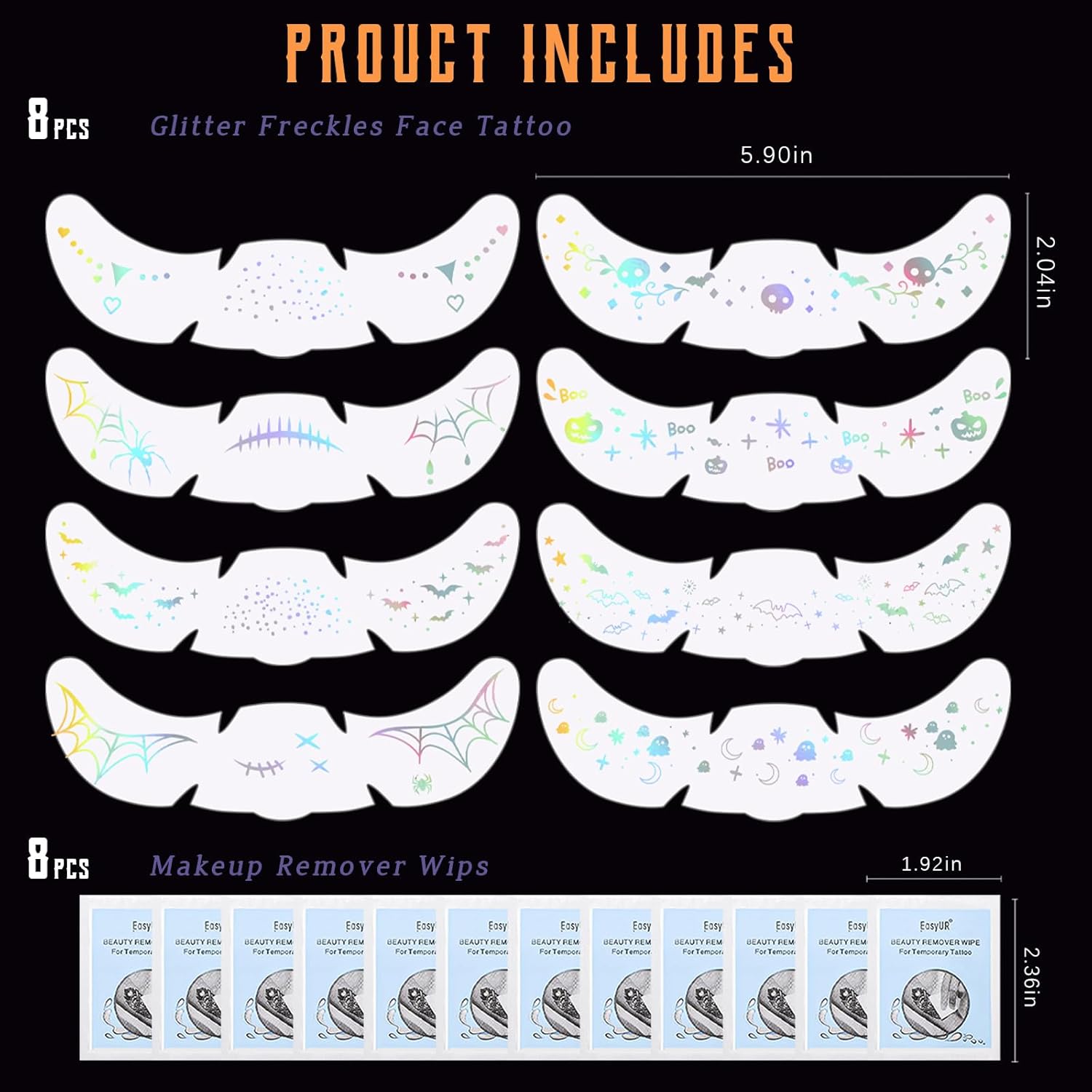 - Package Content: Set includes 8 styles holographic silver halloween freckle stickers and 8pcs tattoo sticker remover wipes. They are made with safe ingredients, so you don't have to worry about bothering your skin