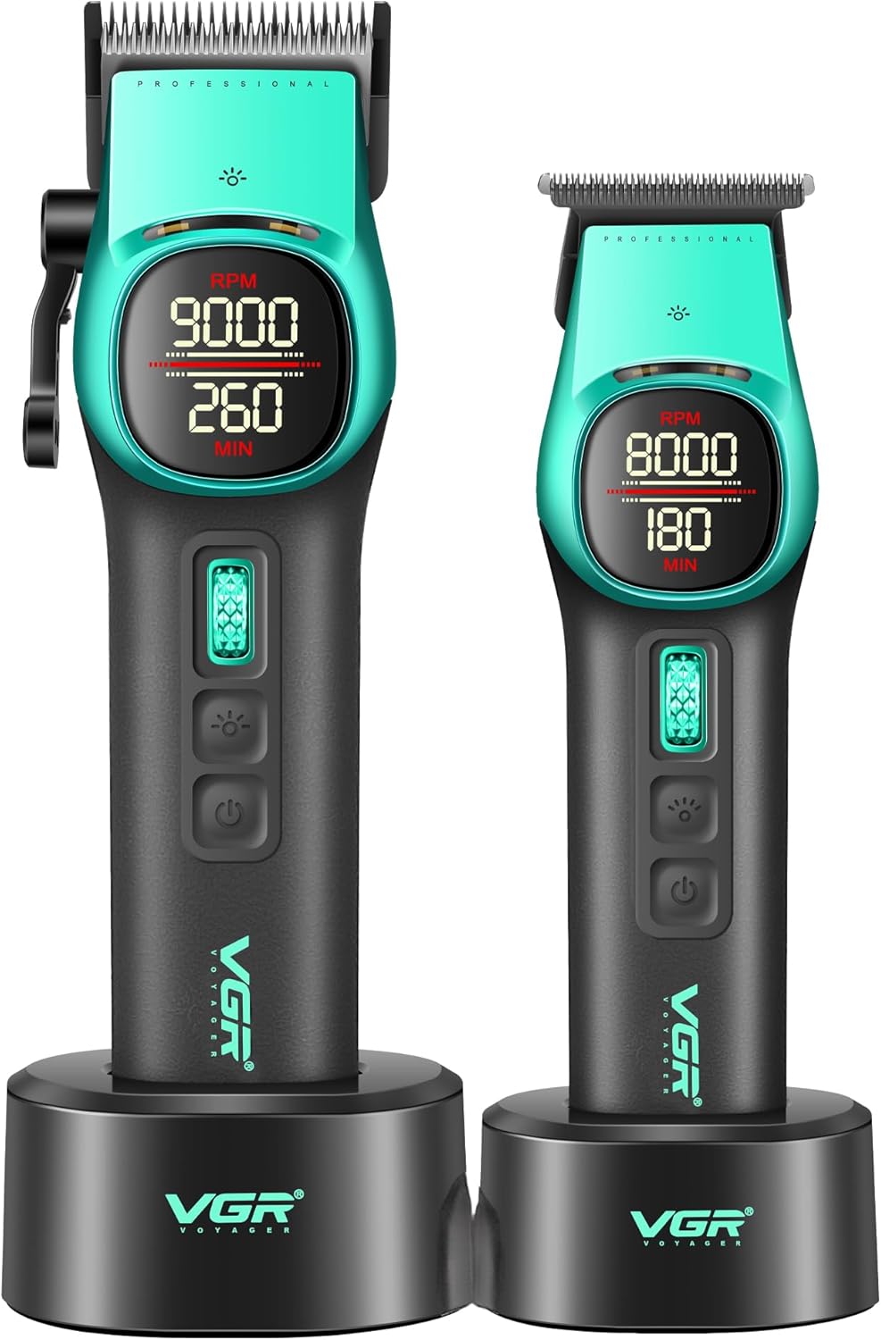 VGR 885 S2 Cordless Barber Clippers and Trimmers Kit, Professional Hair Clippers for Men, Haircut Kit with DLC-Coated Ceramic Blades, 21-Speed Roller, 2 Magnetic Charging Bases, LED Display, Green