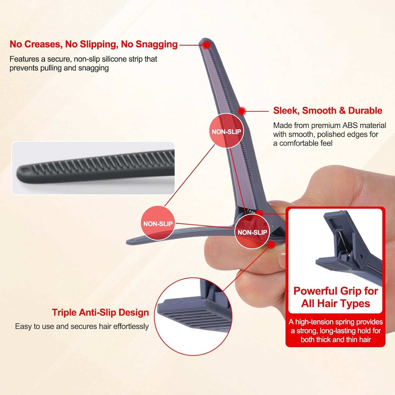 - [TRIPLE-GRIP, NO SLIPPING]: Designed to conquer any hair type, from fine and silky to thick and curly. Our innovative triple-grip design—combining non-slip handles, textured teeth, and a silicone band—ensures these styling clips stay put. They lock hair in place without pulling or snagging, giving you precise control.