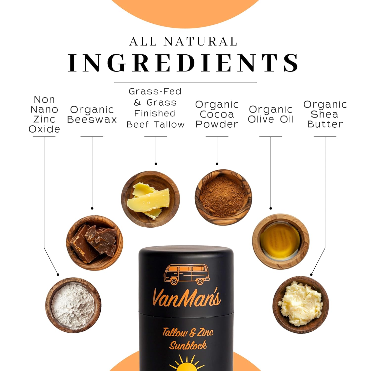 Vanman Tallow and Zinc Sunblock Stick - Mineral Sunscreen with Non-Nano Zinc Oxide - Sunstick Made with Grass Fed Beef Tallow for Face & Body Protection - 3.3 ounce